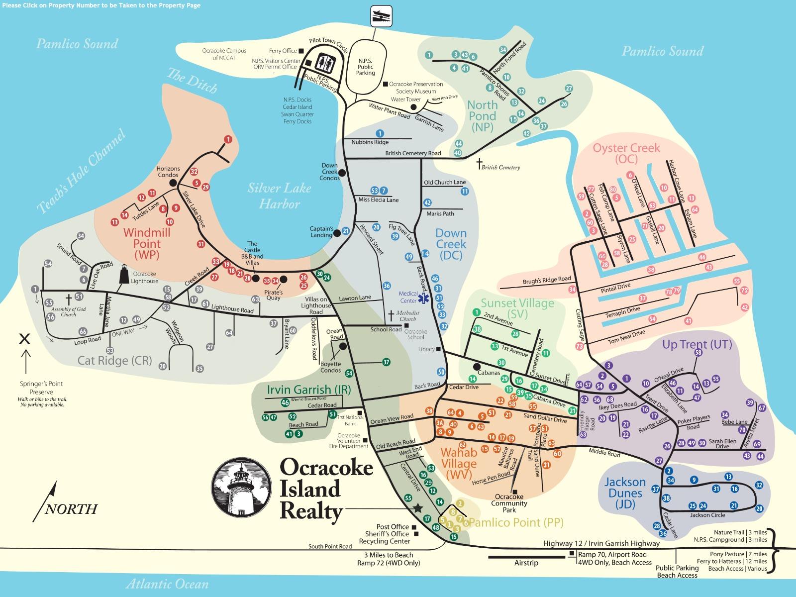 You may also view our interactive map located on our Vacation Rentals tab to explore Ocracoke Village and view your vacation property location. Each property listing also provides an interactive map, showing the property location.