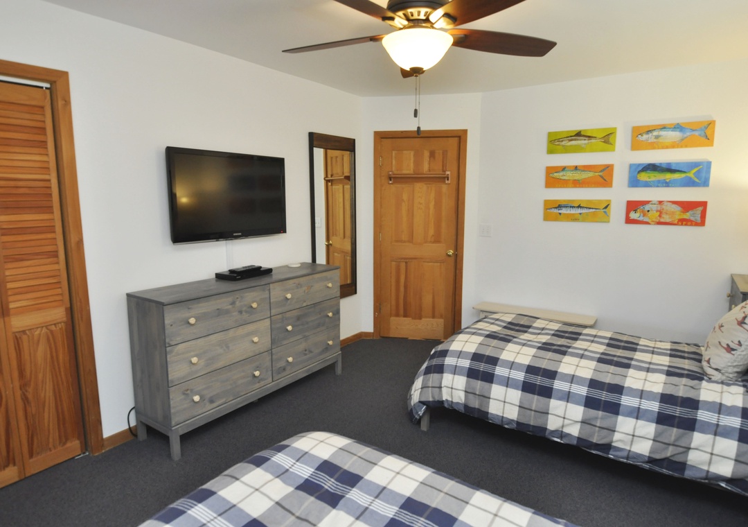 First Floor: Two bedrooms each with two Twins and a TV. Bedroom with Queen and TV. Hallway bath with tub/shower. Laundry area.