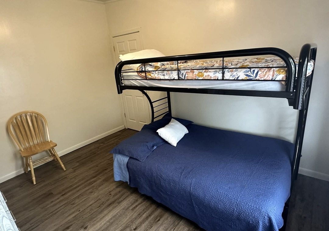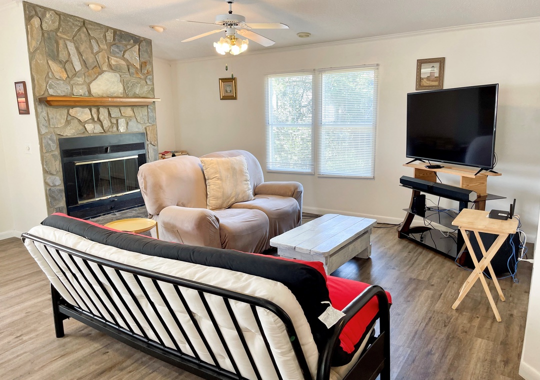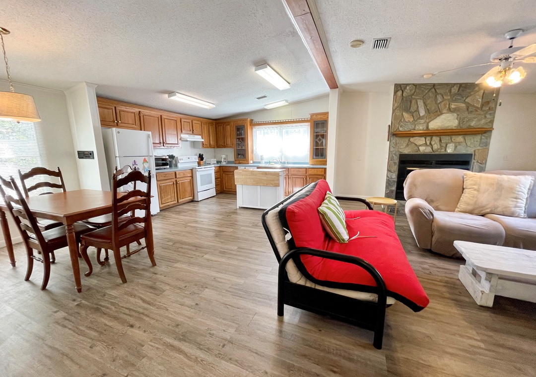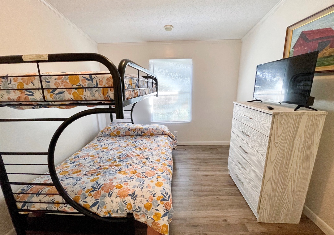 Single story home: Open eat-in kitchen and den with futon and TV. Dining area. Living area with futon. Pirmary Bedroom with Queen, TV, and primary bathroom with garden tub and separate shower. Bedroom with Queen. Bedroom with a Pyramid Bed (double on bottom and twin on top). Hallway bathroom with tub/shower. Half bath off the Laundry Room.