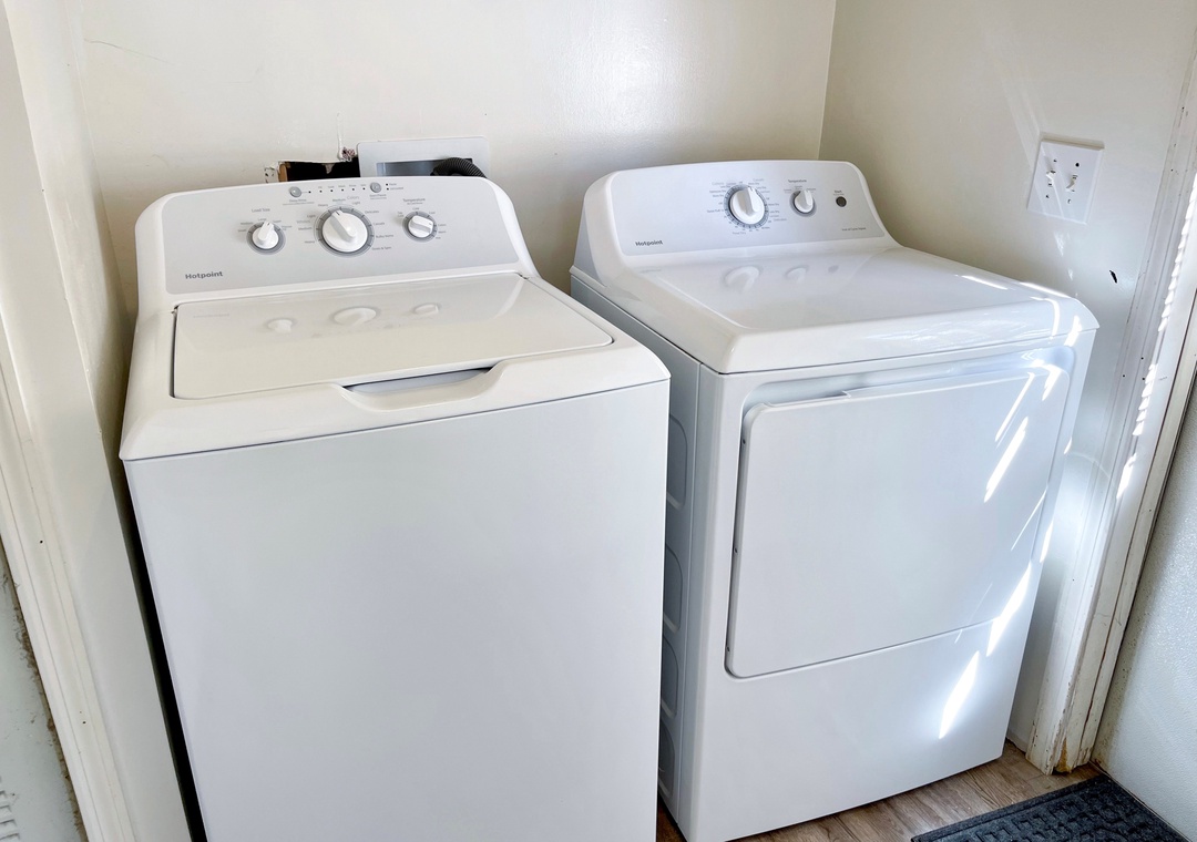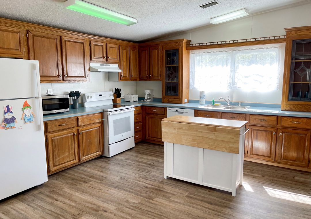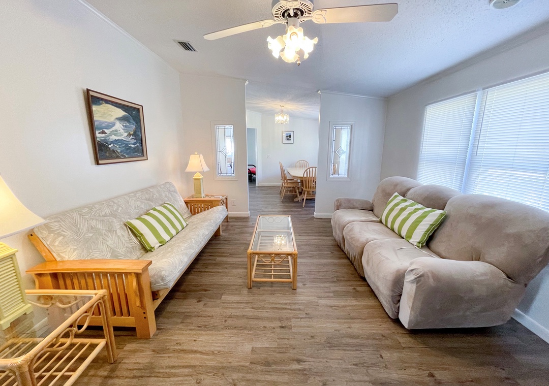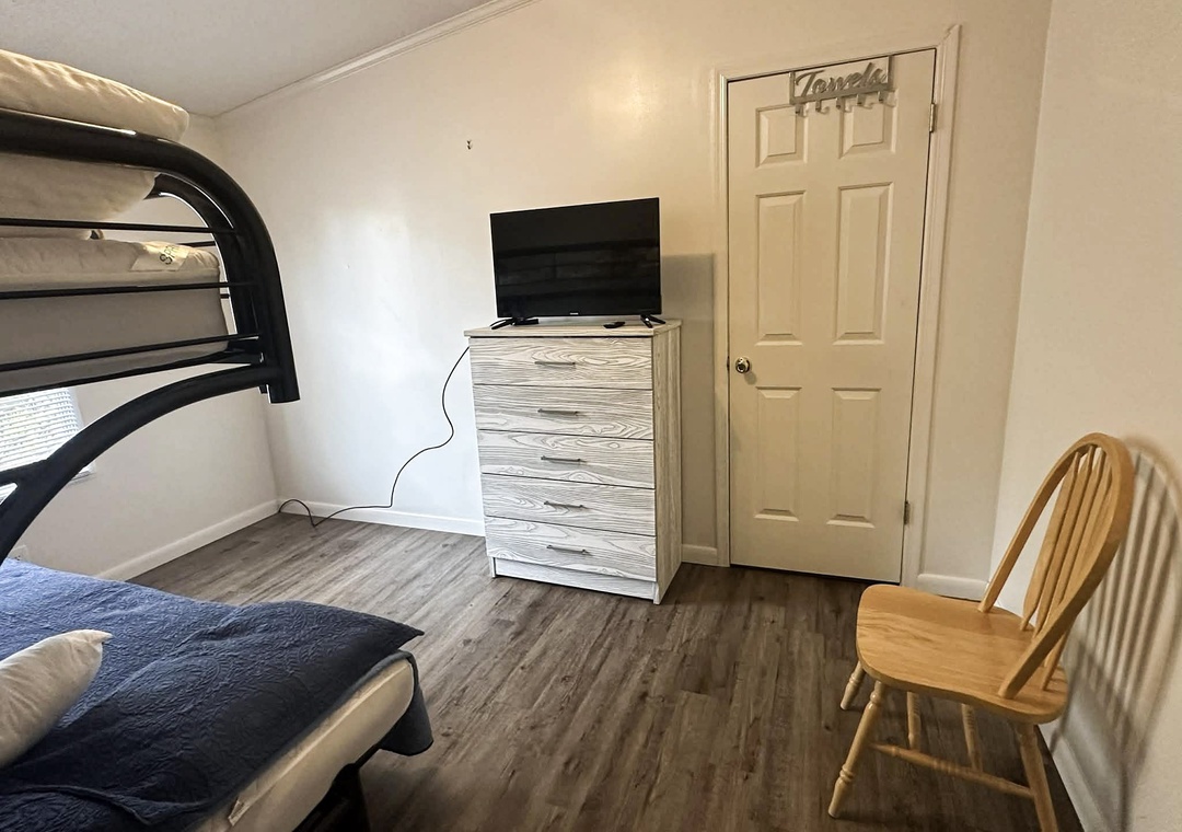 Single story home: Open eat-in kitchen and den with futon and TV. Dining area. Living area with futon. Pirmary Bedroom with Queen, TV, and primary bathroom with garden tub and separate shower. Bedroom with Queen. Bedroom with a Pyramid Bed (double on bottom and twin on top). Hallway bathroom with tub/shower. Half bath off the Laundry Room.