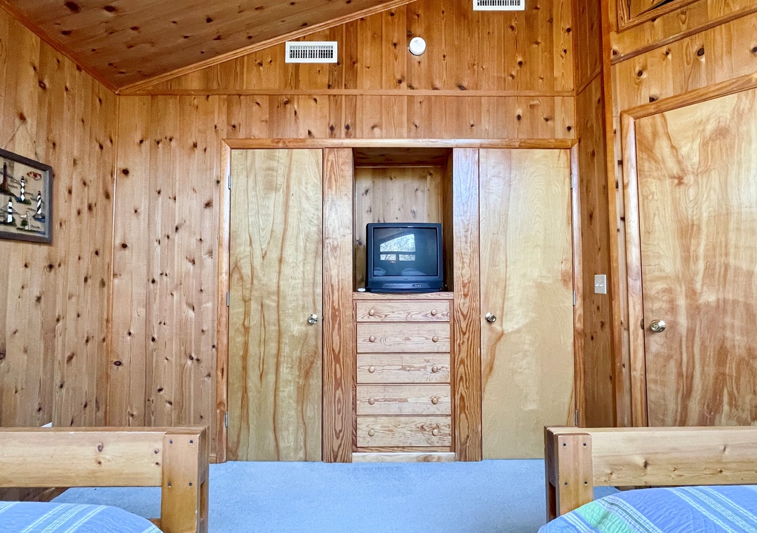 Second Floor: Primary Bedroom with Queen, TV, and bathroom with shower stall. Bedroom with Queen and bedroom with two twins which share a half bathroom.