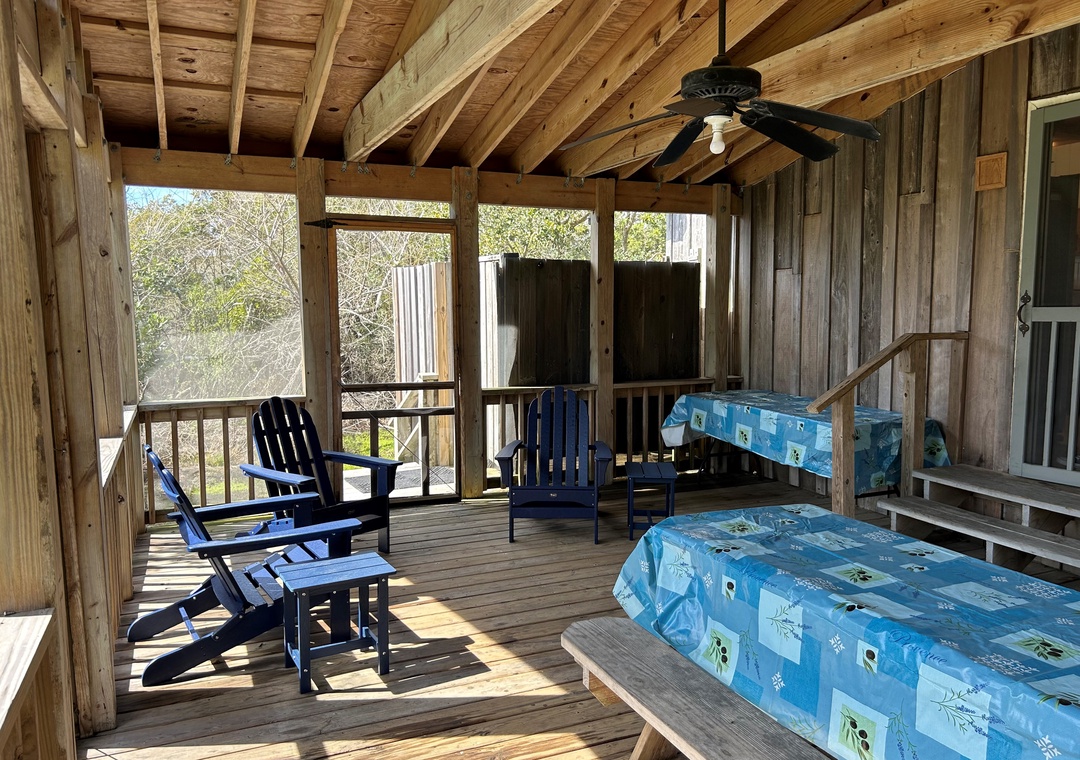 The exterior offers two screened porches, including one 21' x 16' screened porch with a picnic table, a front covered porch, large back yard, two hot/cold outdoor showers, charcoal grill, fish cleaning bench, deck swing, and hammock.