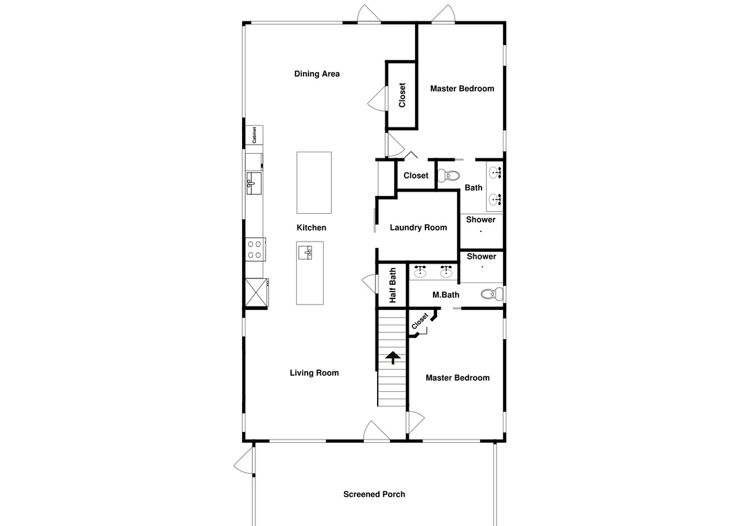 First Floor: Living area w/ Smart TV and DVD player. Kitchen and dining area. Primary Bedroom 1 with King Bed with private bath with shower stall, TV. Primary Bedroom 2 with King Bed with private bath with shower stall, TV. Half Bath. Laundry Room.