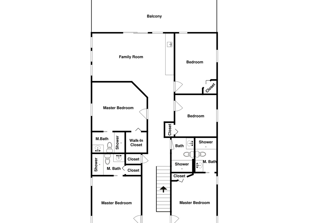 Second Floor: Entertainment Room with smart TV, DVD, kitchenette including mini drink refrigerator. Primary Bedroom 3 with King Bed with private bath with shower stall, TV. Primary Bedroom 4 with King Bed with private bath with shower stall, TV. Primary Bedroom 5 with King Bed with private bath with shower stall, TV. Bedroom 6 with two Twin Beds. Bedroom 7 with Pyramid Bed (double on bottom/twin on top) and extra twin. Hallway Bath with tub/shower.