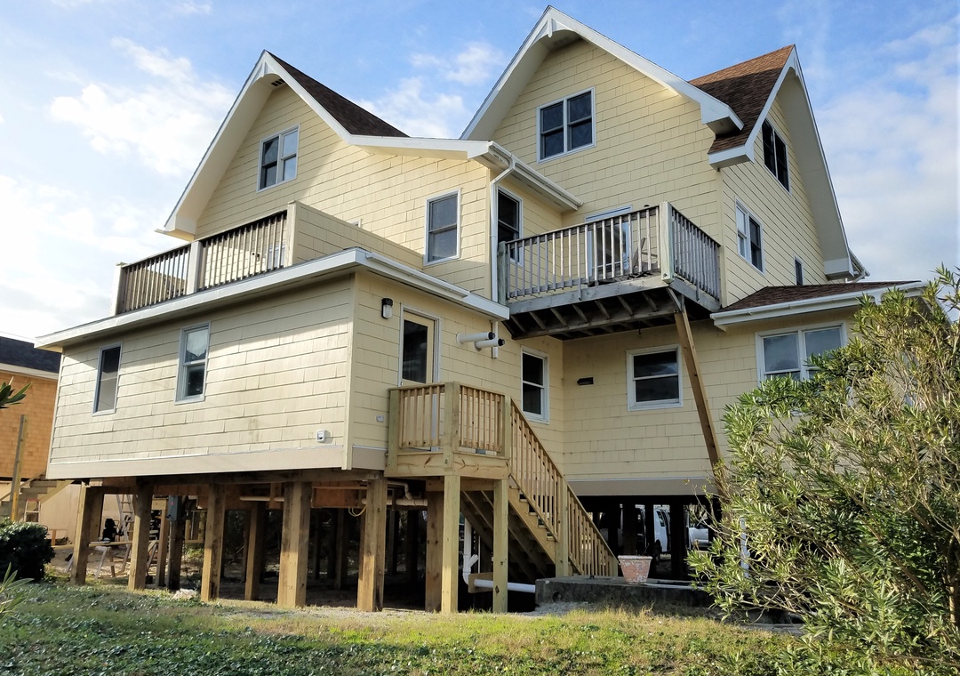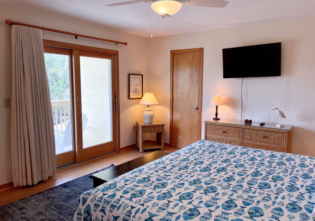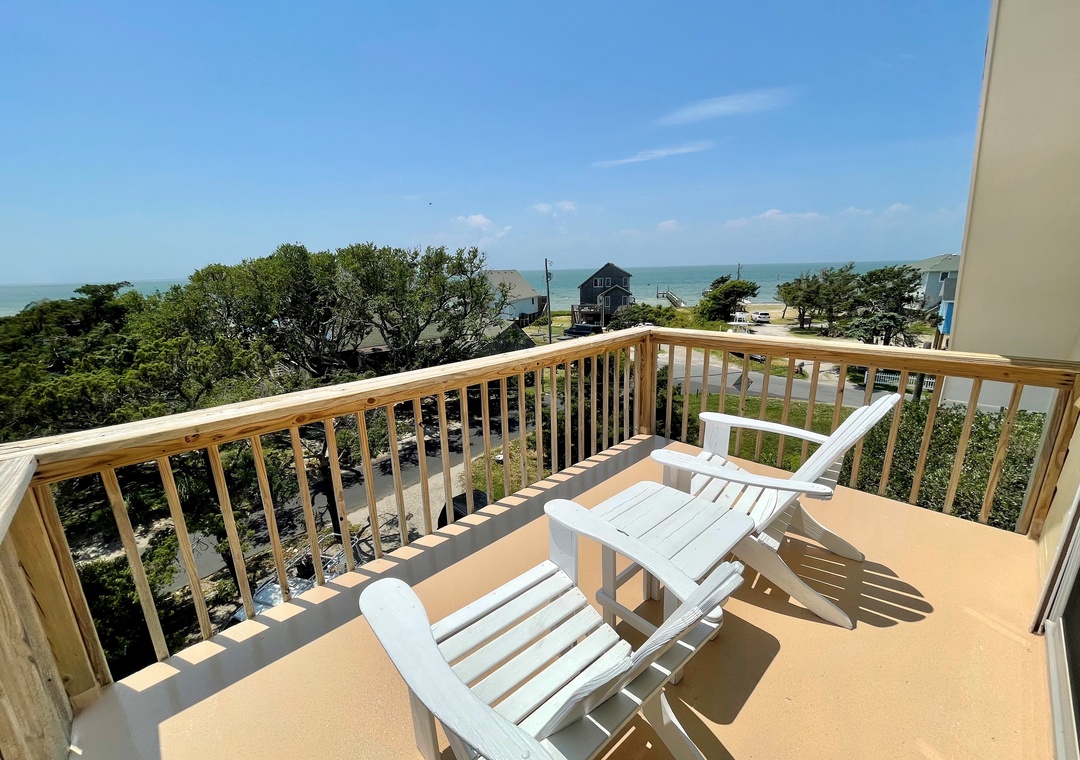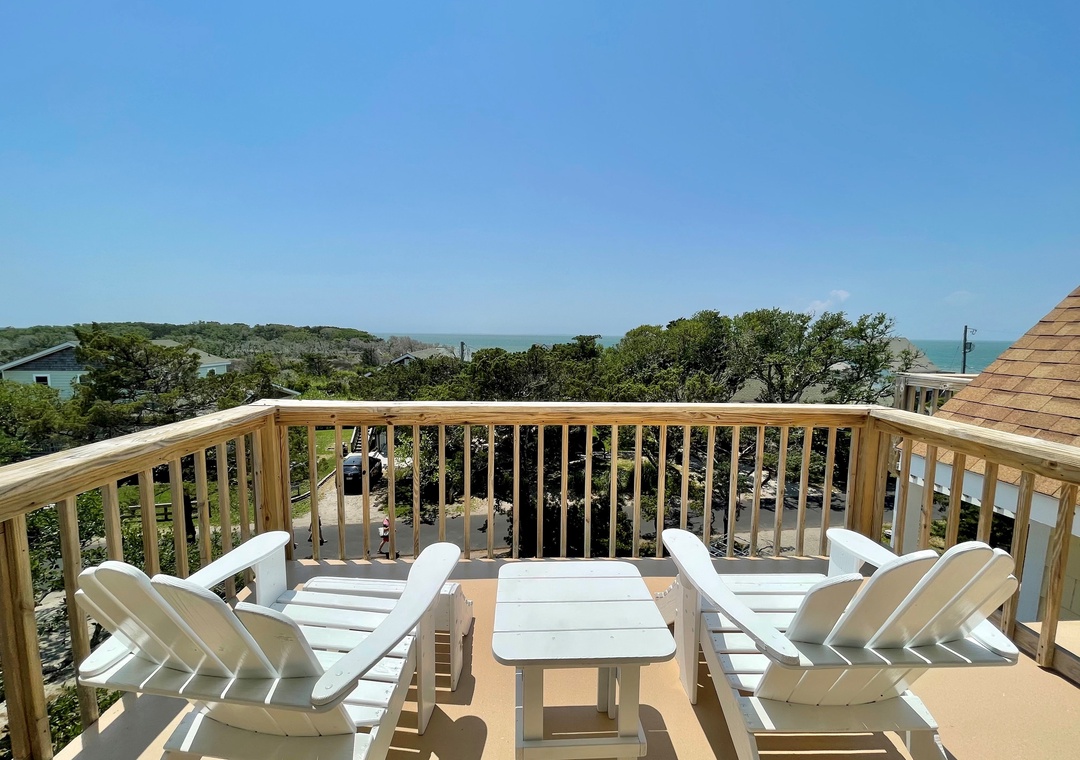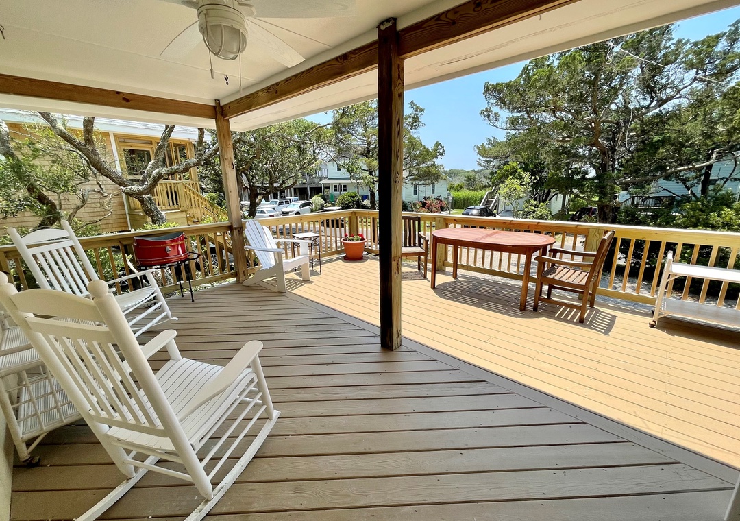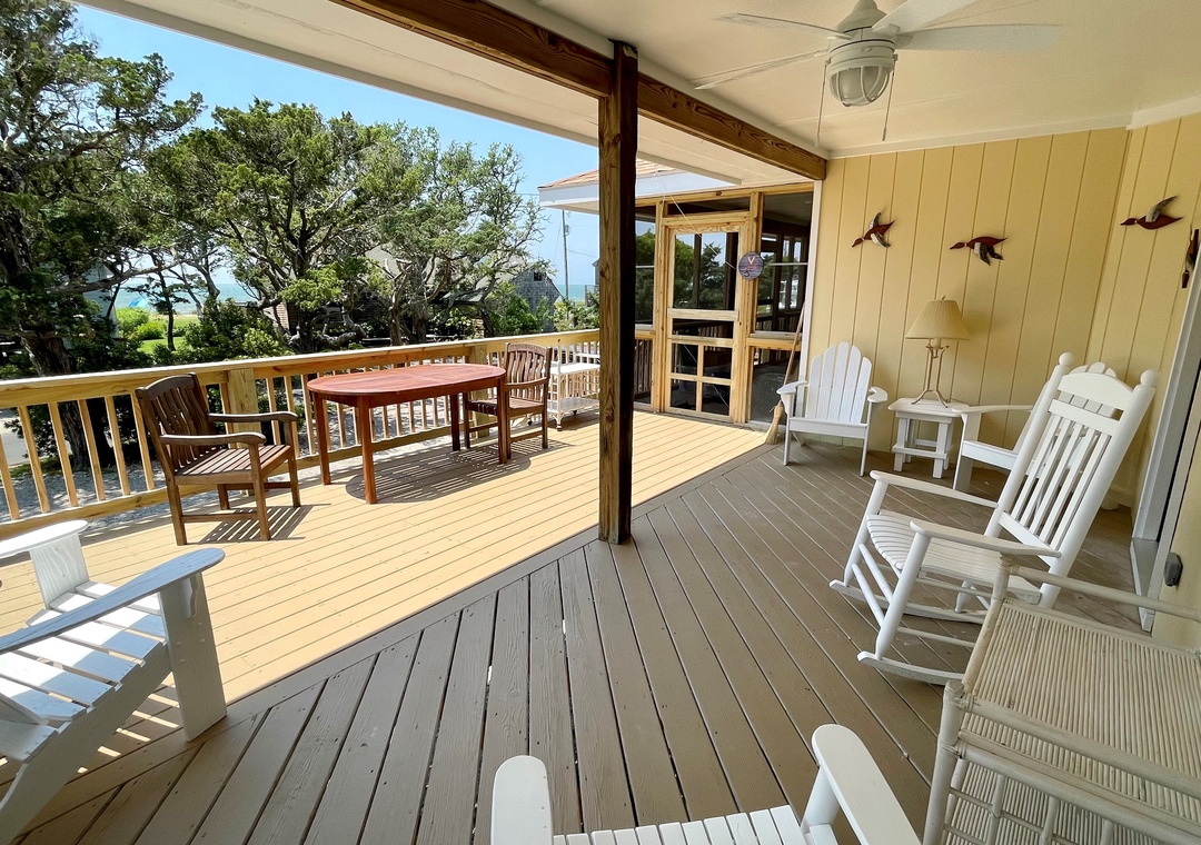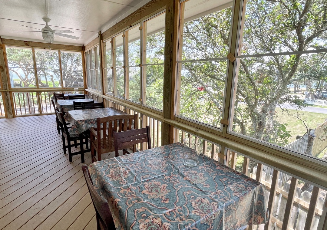 All bedrooms offer an adjoining deck. The decks off the second and third-floor front bedrooms provide a selection of views, including the Pamlico Sound at Teach’s Hole and the treetops of nearby Springer’s Point Refuge. Relax or dine on the spacious first-floor screened porch.