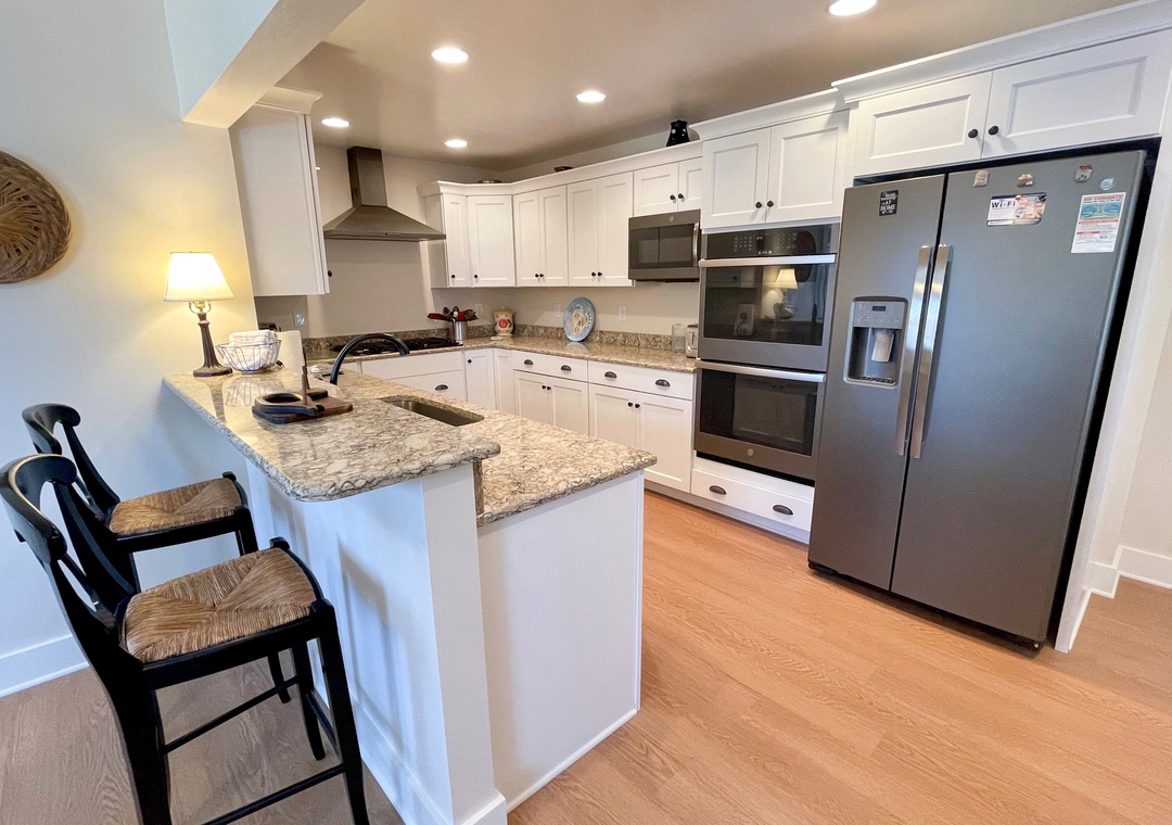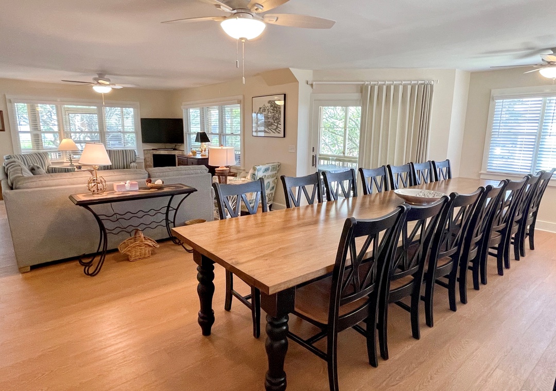 This spacious home features a large open Dining and Living Area with a TV and seasonal gas fireplace. An open kitchen with quartz countertops, two ovens, a gas stove, two dishwashers, a refrigerator, and a microwave. A convenient wet bar area offers an additional full-size refrigerator, additional cabinetry, and a spacious pantry. Dining options include the main dining table with seating for 16, a kitchen bar with stools, and a breakfast room with table for 6 adjoining the kitchen.