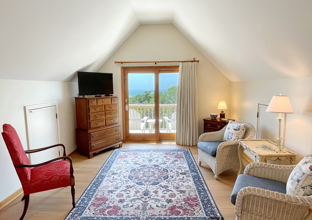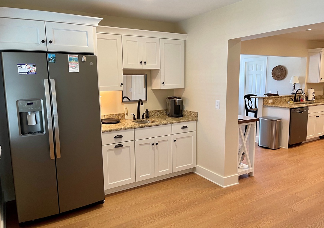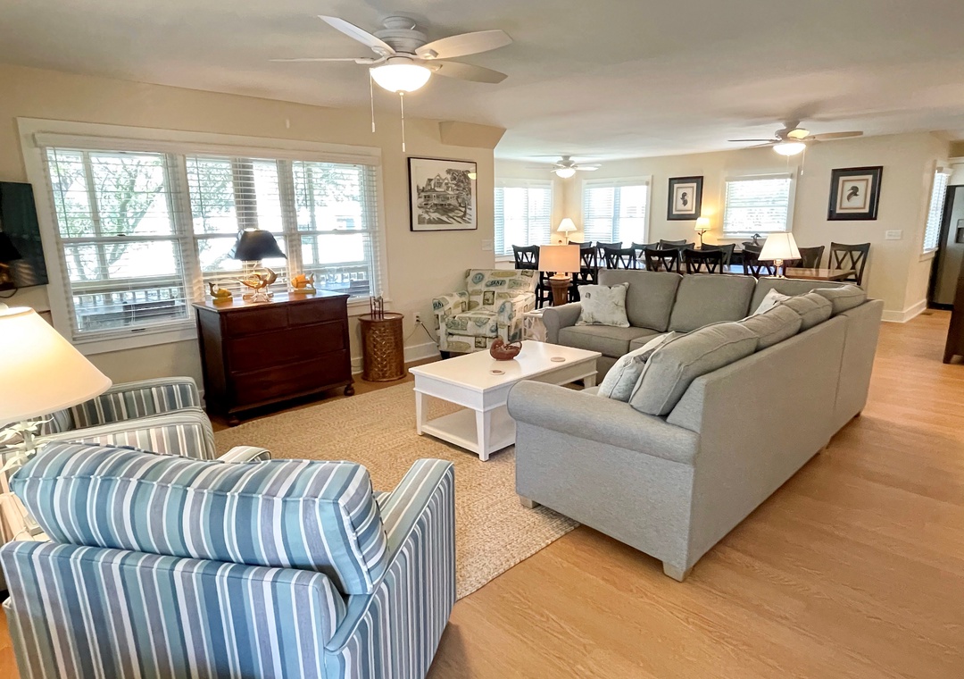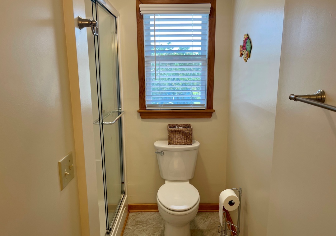 First Floor: Large open Dining and Living Area with TV and seasonal gas fireplace. Kitchen, Breakfast Room, and Wet Bar with additional full-size refrigerator. Full bath with shower and Half Bath. Laundry area. Primary Bedroom with Queen Bed, TV, private Bath with whirlpool tub/shower and partially covered front deck adjoining a screened porch with stairway access. Screened porch with dining tables and Adirondack chairs.