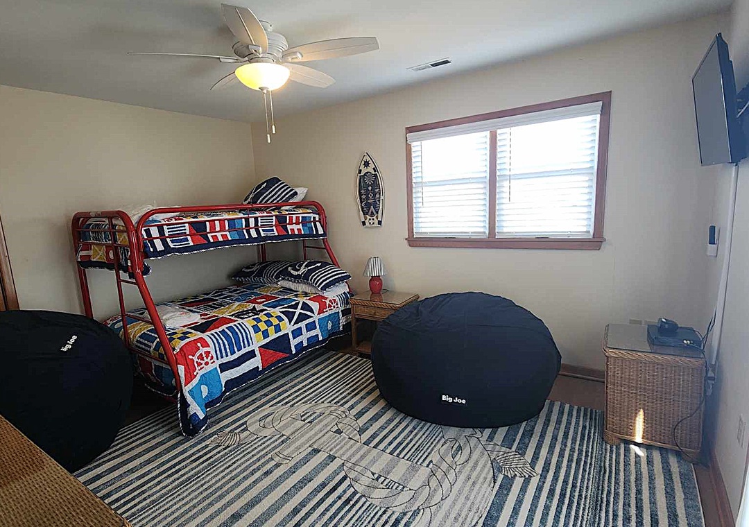 Second Floor: Left front Primary Bedroom with King Bed, TV, private Bath with shower and adjoining covered deck. Right front Primary Bedroom with King Bed, TV, private Bath with shower, and adjoining covered deck. Rear Primary Bedroom with 2 Twin Beds, TV, private bath with tub/shower and adjoining deck. Bedroom with Pyramid Bed (Double on bottom/twin on top), adjoining deck, and bath with tub/shower (also accessed by hallway).