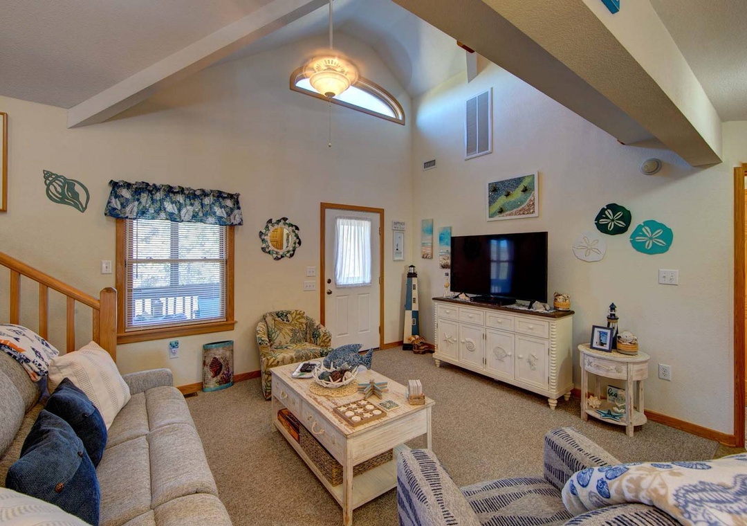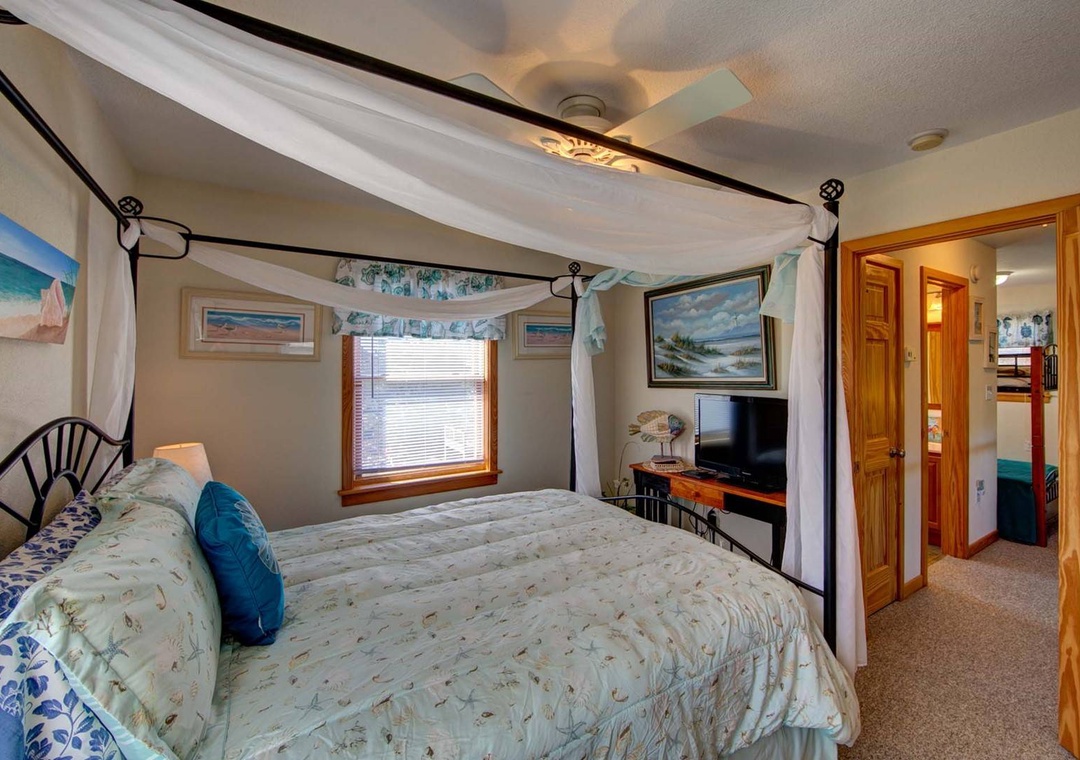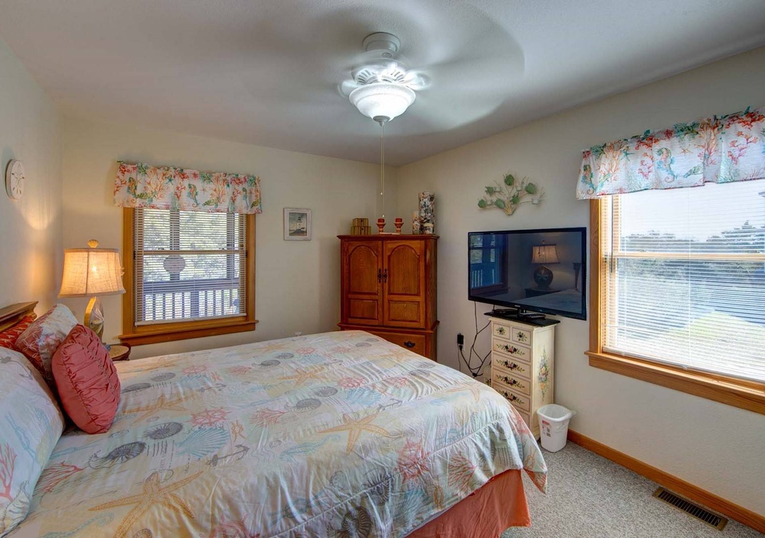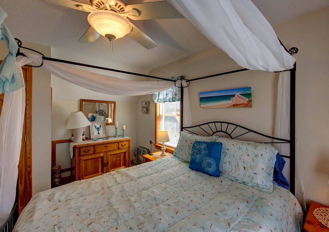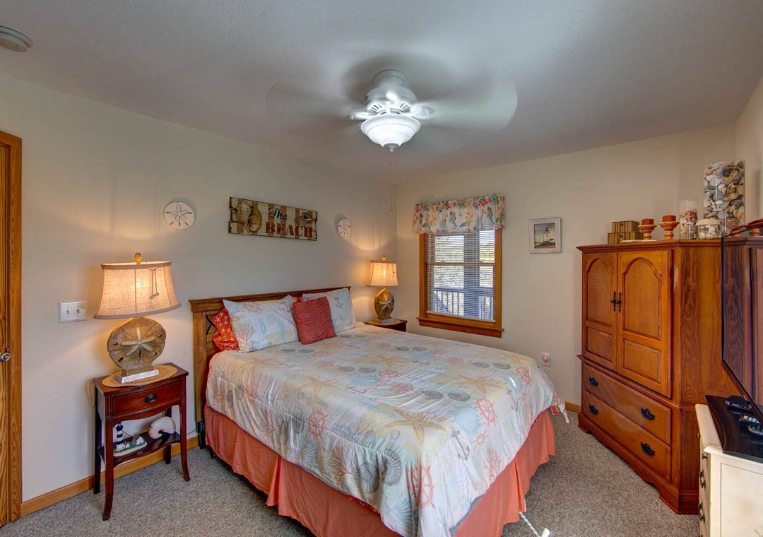 Inside, you’ll find two comfortable bedrooms, both with queen sized beds, two full bathrooms, and a cozy open loft featuring a pyramid bed with a double over queen, perfect for relaxing after a day of adventure. Step out onto one of two spacious decks, including a screened-in front porch ideal for enjoying the island breeze on warm evenings.