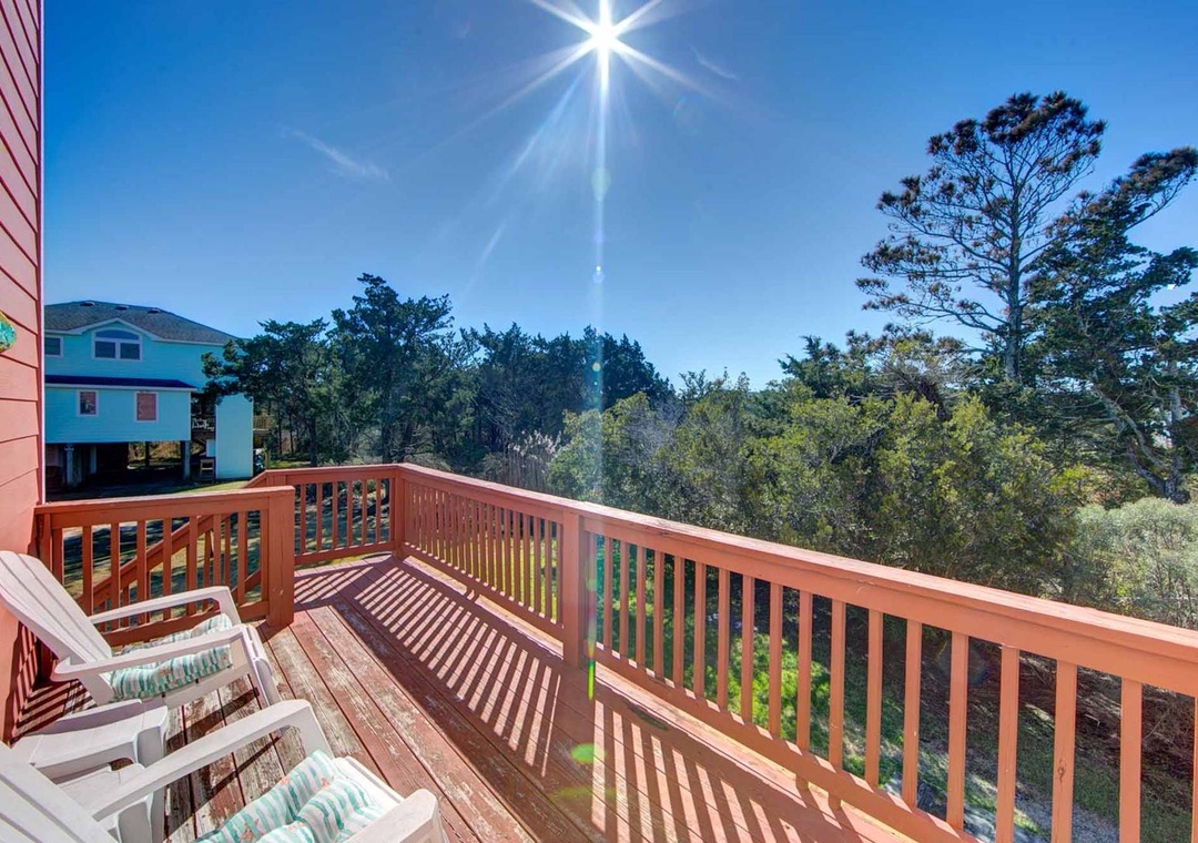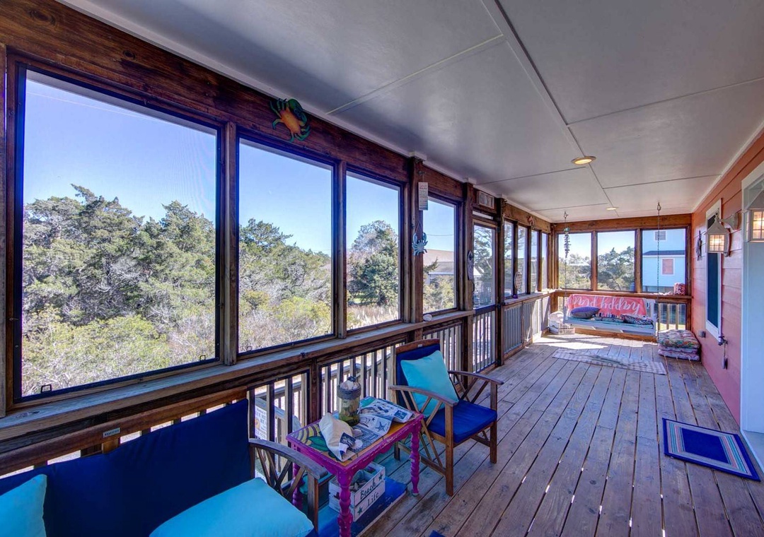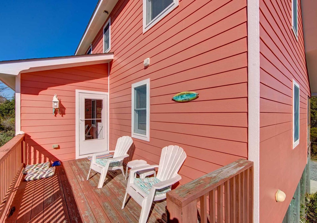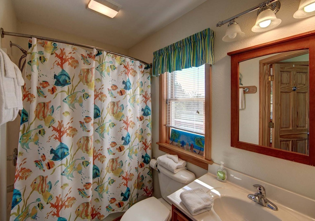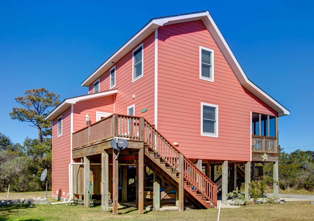 Inside, you’ll find two comfortable bedrooms, both with queen sized beds, two full bathrooms, and a cozy open loft featuring a pyramid bed with a double over queen, perfect for relaxing after a day of adventure. Step out onto one of two spacious decks, including a screened-in front porch ideal for enjoying the island breeze on warm evenings.