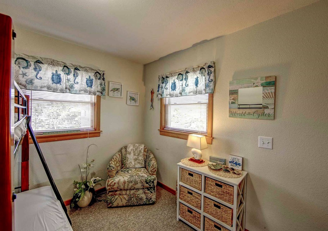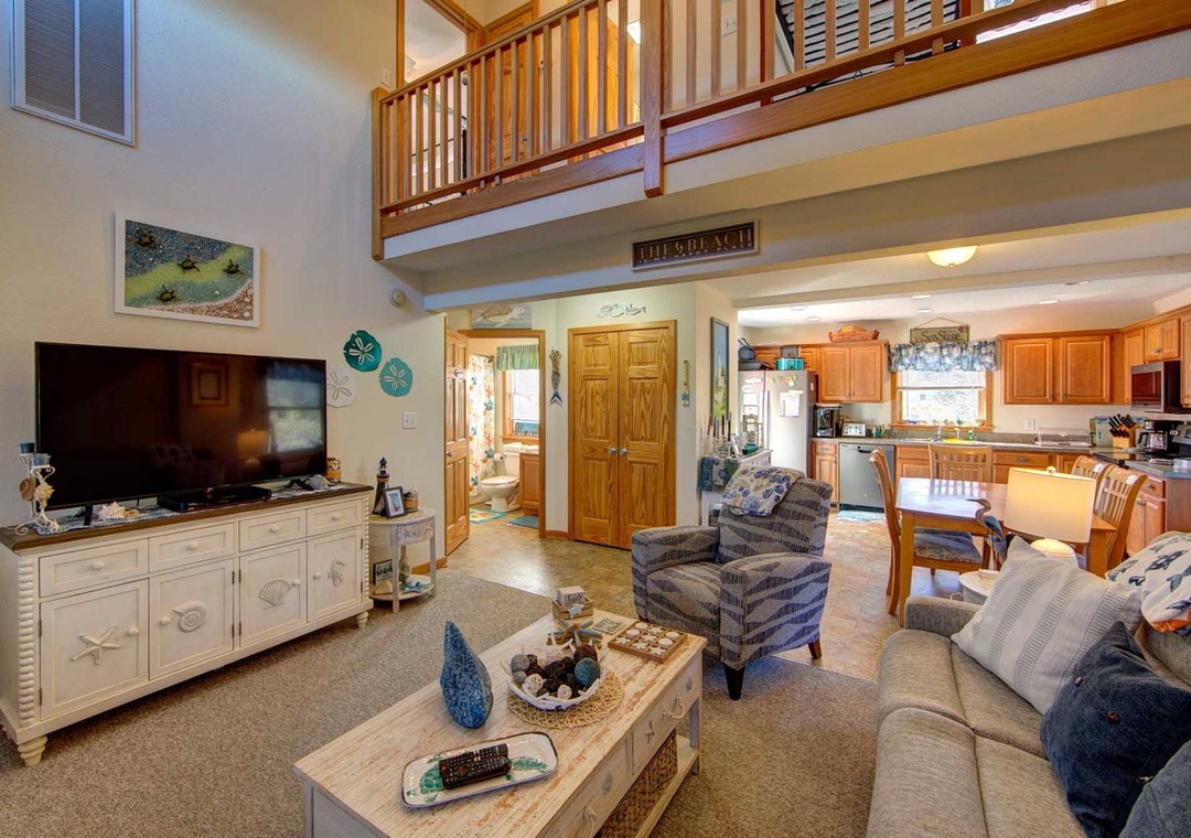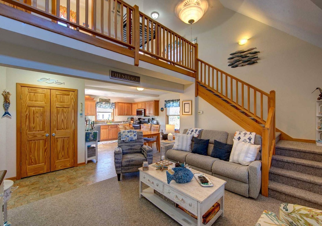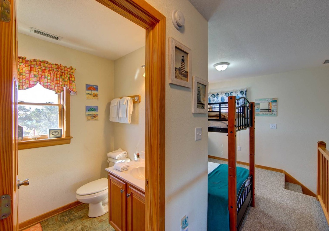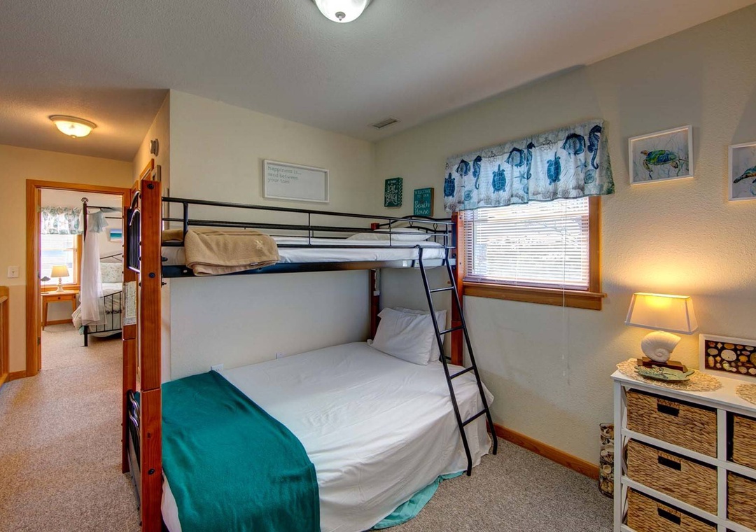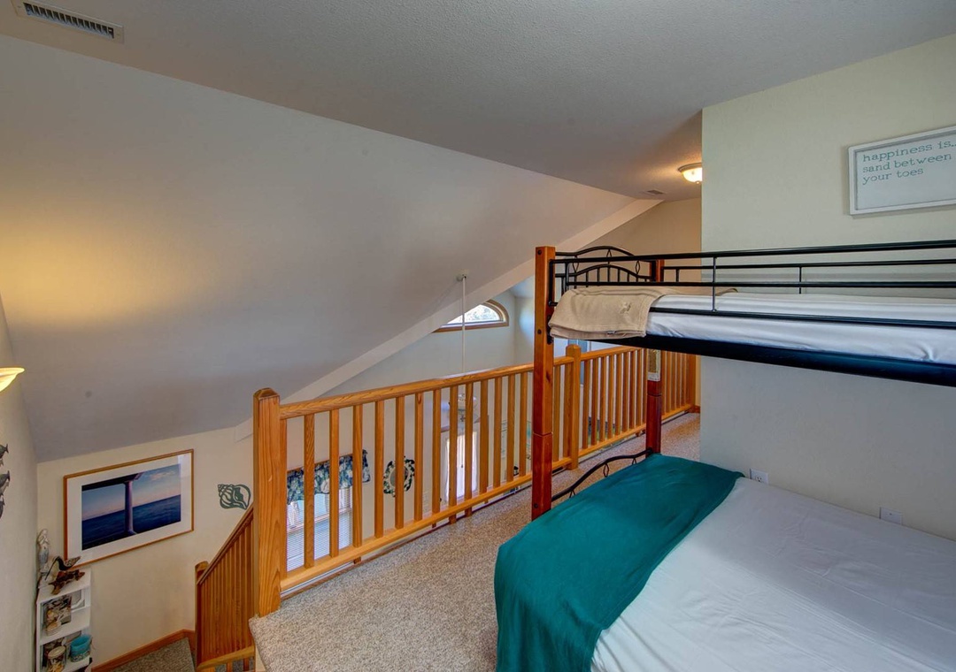 Second Floor: Common Area with Pyramid Bunk Bed (Queen on the bottom, Double on the Top). Bedroom with Queen. Full Bath.