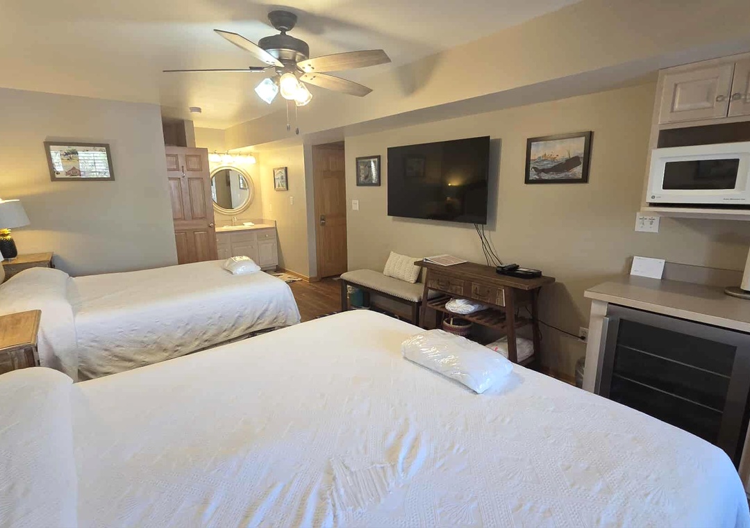 Bedroom A has a King bed, TV, full bath with whirlpool tub and separate shower, and screened porch access. Bedroom B offers a King and Queen bed, TV, full bath with tub/shower, vanity sink, porch access, and kitchenette with toaster, mini-refrigerator, microwave, coffee maker, and sink. Single Sleeper Sofa in the living area.
