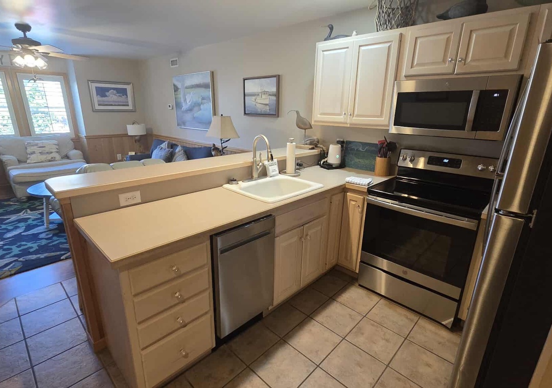 This first-floor villa offers a view of Silver Lake from the screened porch, a large living area with TV and single sleep sofa, a full kitchen with bar and table seating, washer/dryer access, and wireless internet access. The bedroom has a King bed, TV, full bath with whirlpool tub and separate shower, and access to the screened porch.