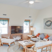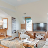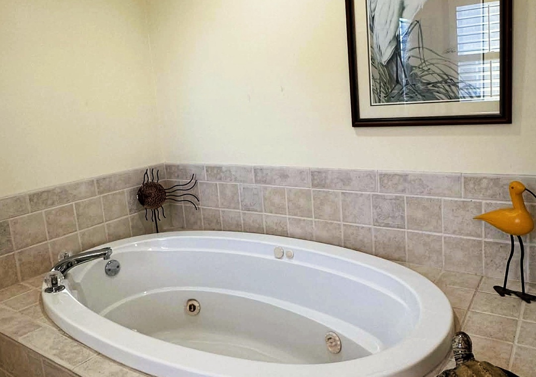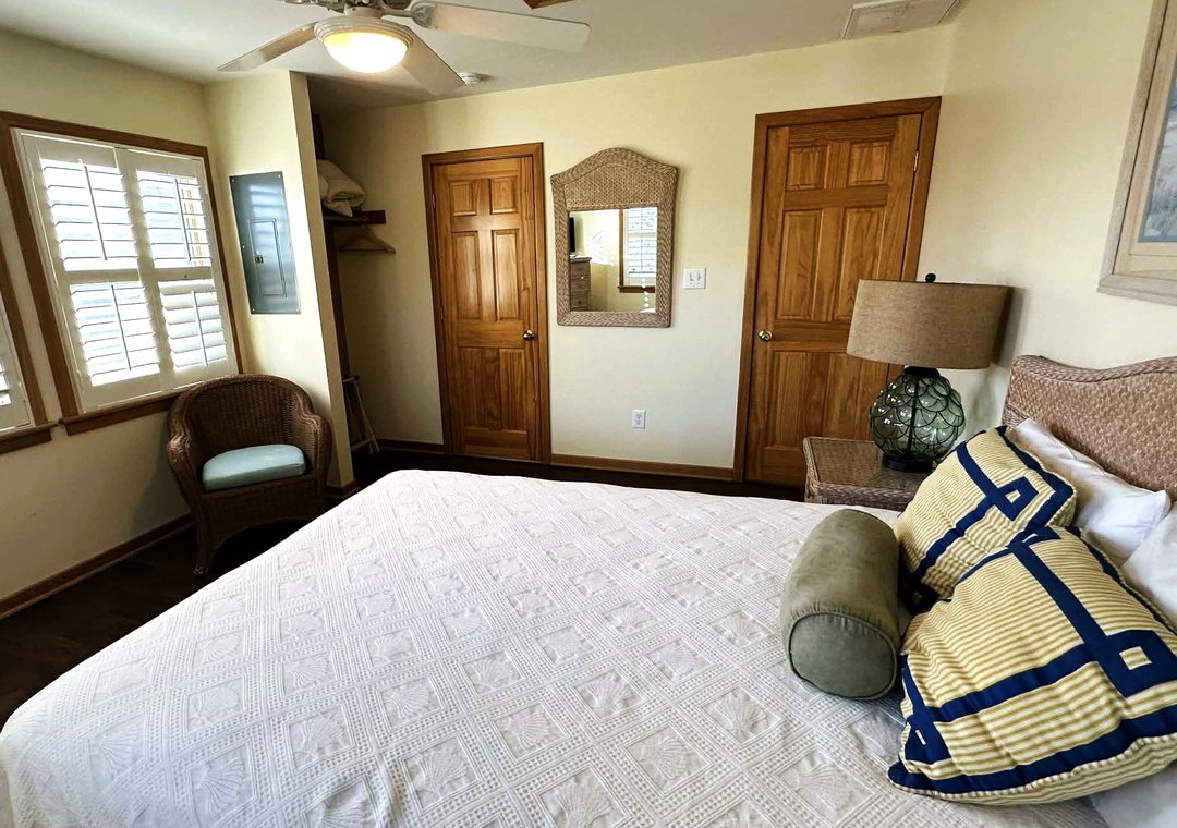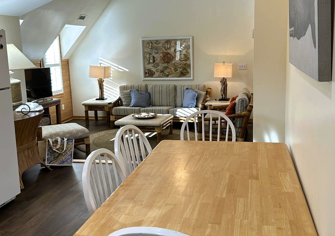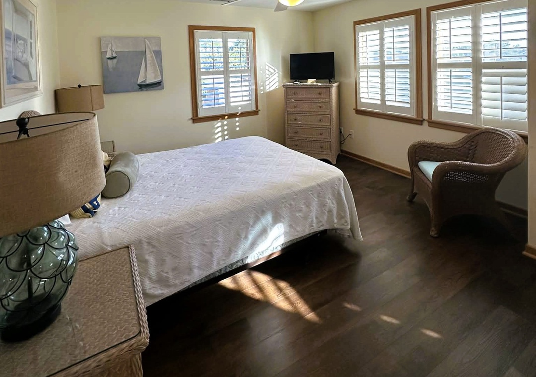 This second-floor villa offers a large living area with TV, full kitchen with dining table, queen bedroom with TV, spacious bath with whirlpool tub and separate glass shower, washer/dryer and complimentary wireless internet access. This villa is accessed via outdoor stairs.