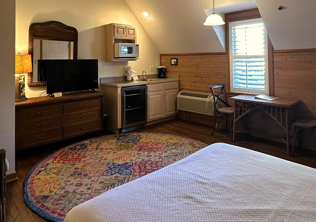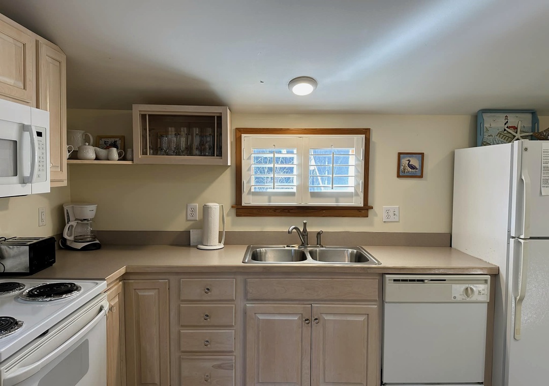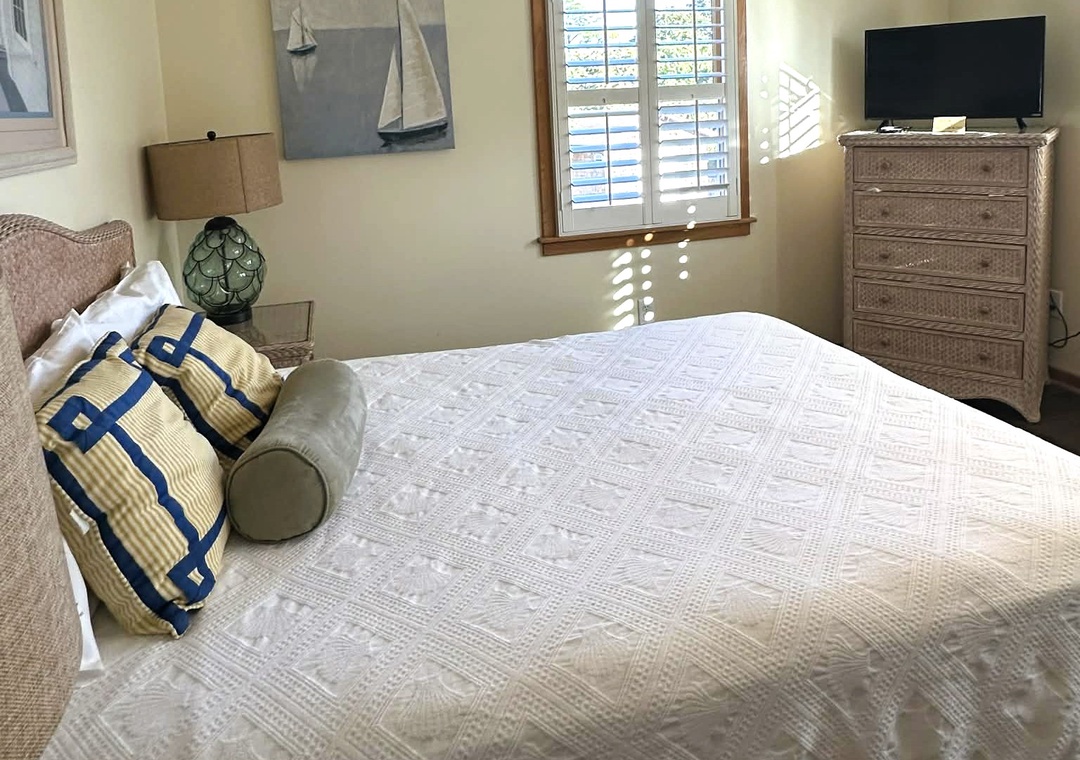 This second floor two bedroom, two bath villa offers a large living area with TV, full kitchen with dining table, dishwasher, kitchenette (toaster, mini-refrigerator, microwave, coffee maker and sink), washer/dryer, complimentary wireless internet access. Each bedroom has a Queen bed.