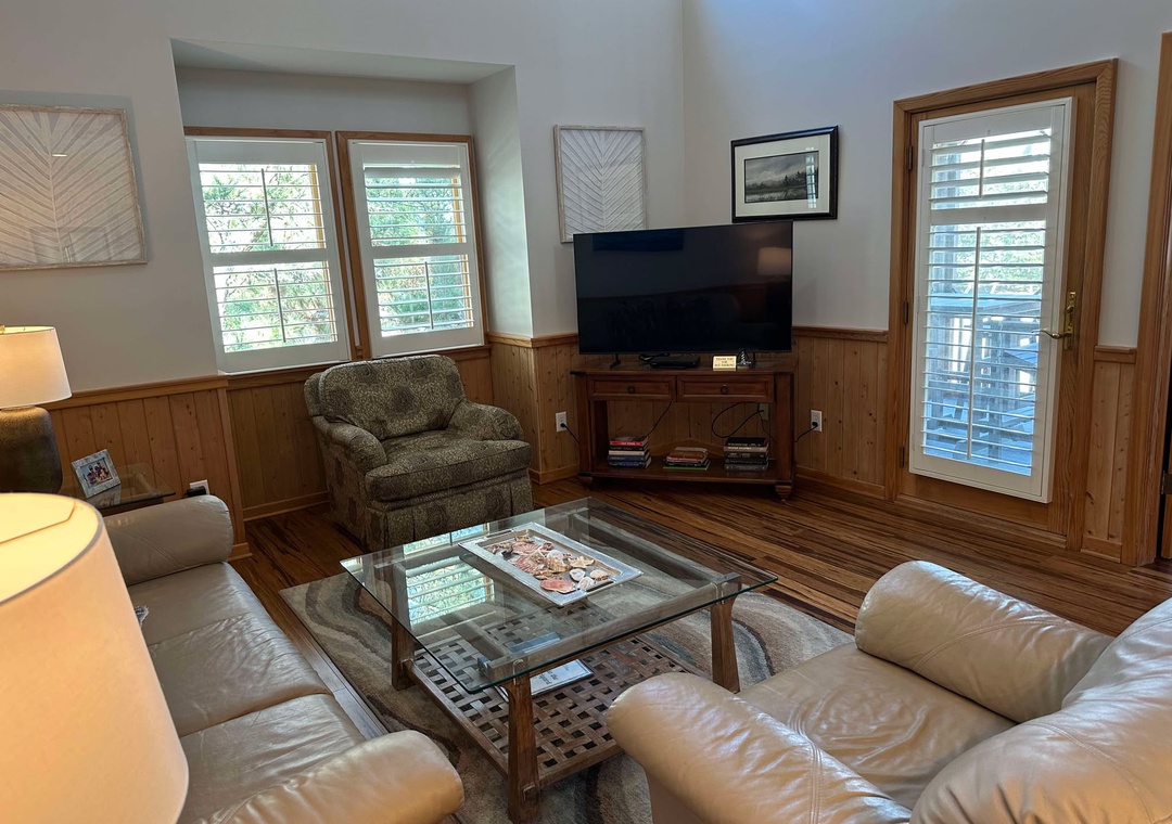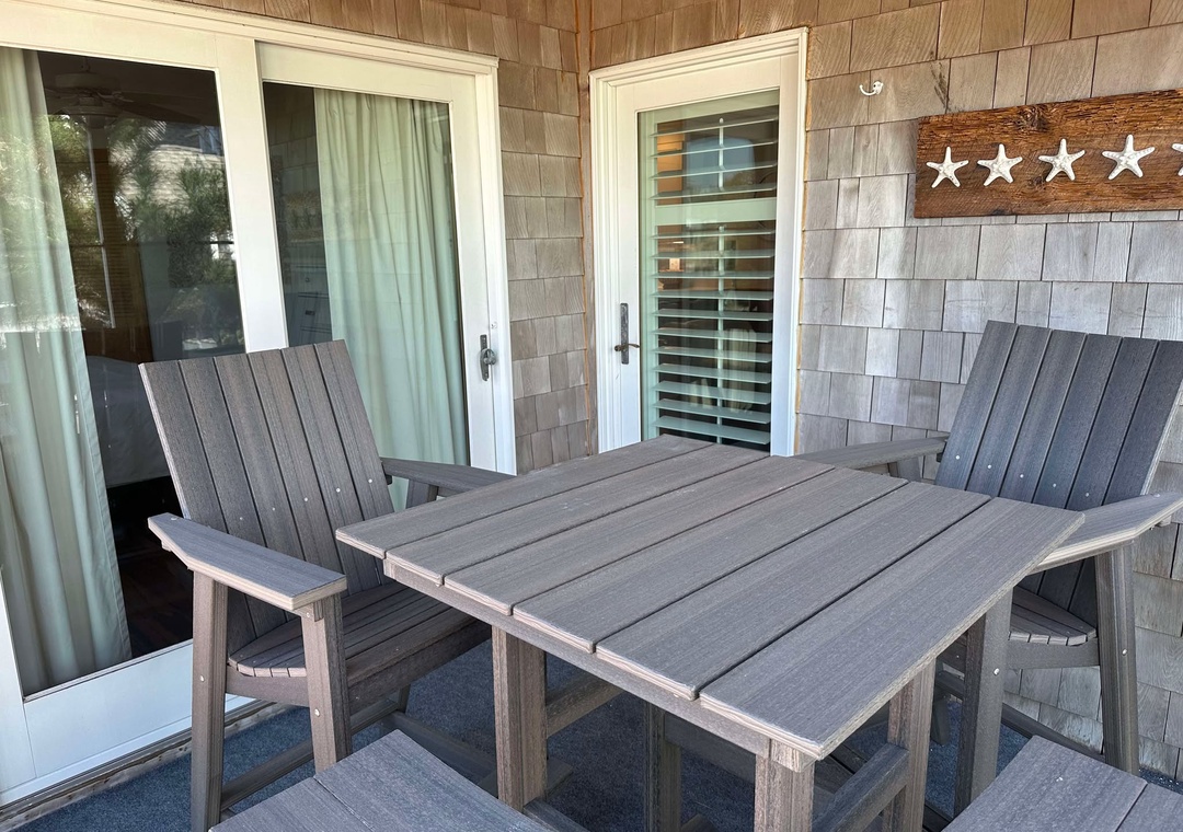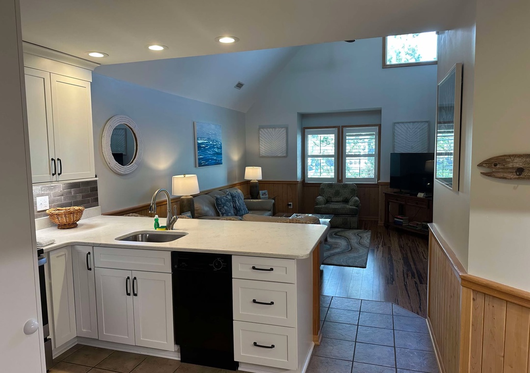 This second floor villa offers a spacious living area with big screen TV, DVD, newly renovated full kitchen with bar and table seating, screened porch with a limited view of the harbor, wireless internet access, and washer/dryer access. The bedroom has a King Bed, TV, DVD, screened porch access, and a full bath with a newly tiled walk-in shower.