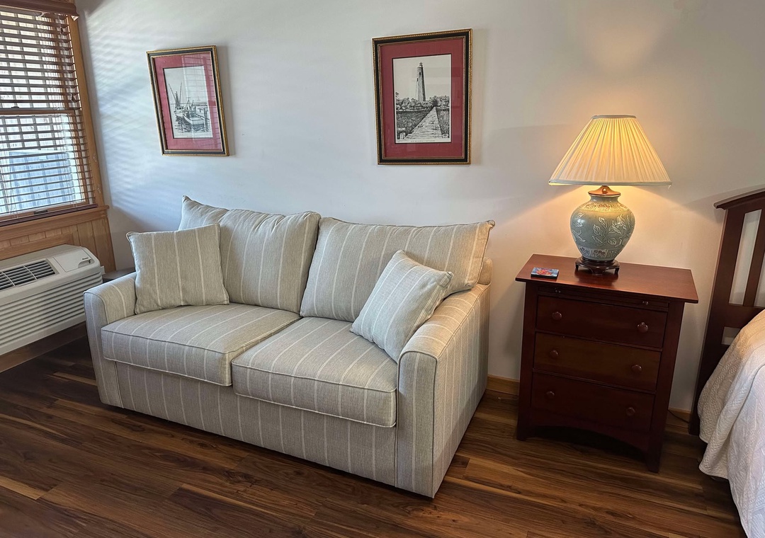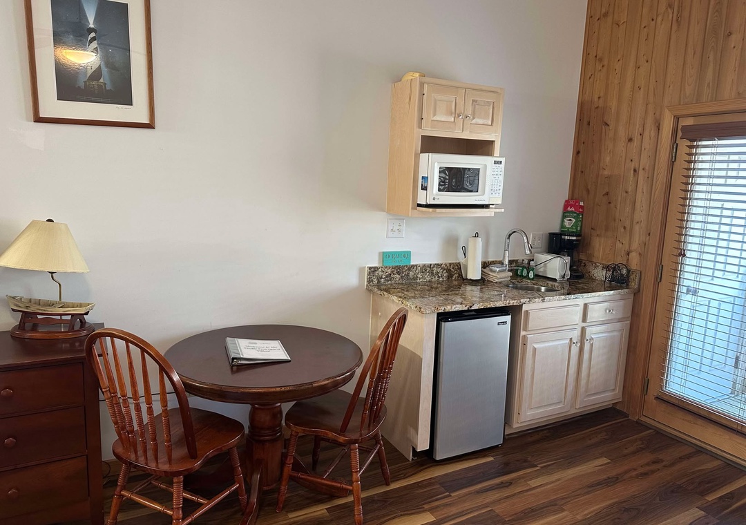 This second floor studio has a Queen Bed, Twin Sleeper Sofa, full bath with tub/shower, TV, wireless internet access, balcony with a limited view of Silver Lake, table and two chairs, washer/dryer access, and kitchenette with toaster, mini-refrigerator, microwave, coffee maker and sink.