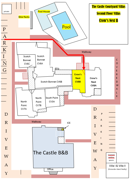 Amenities shared exclusively by guests of The Courtyard Villas and The Castle Bed and Breakfast include an outdoor pool. The pool is open mid April through October. Additional shared amenities include a pool house with a sauna. Outdoor shower.