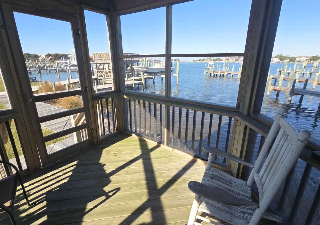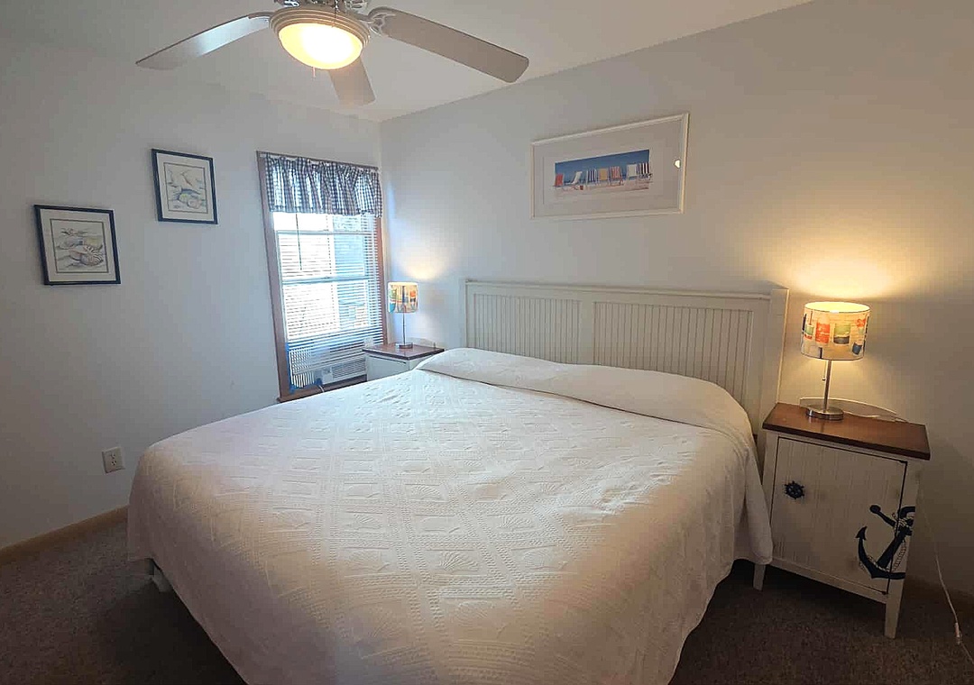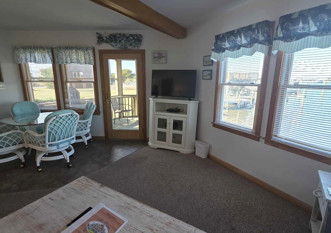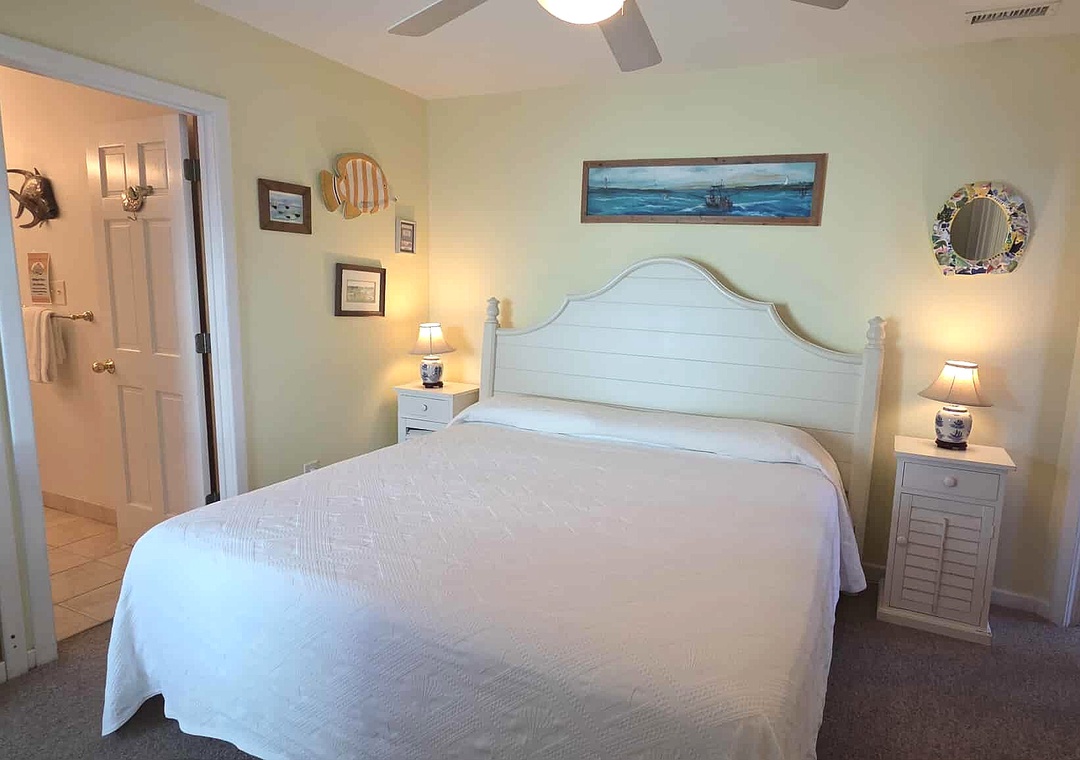 Bedroom B on the lower level has a king bed, full bath, TV, screened porch, and kitchenette with full refrigerator, electric skillet, microwave, toaster, coffee maker, and sink. Access to Screened Porch on harbor.