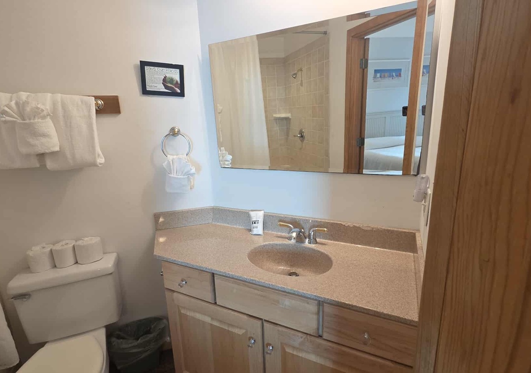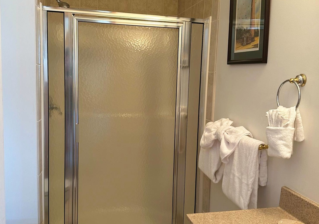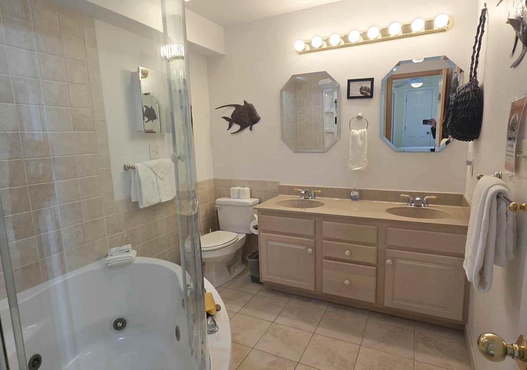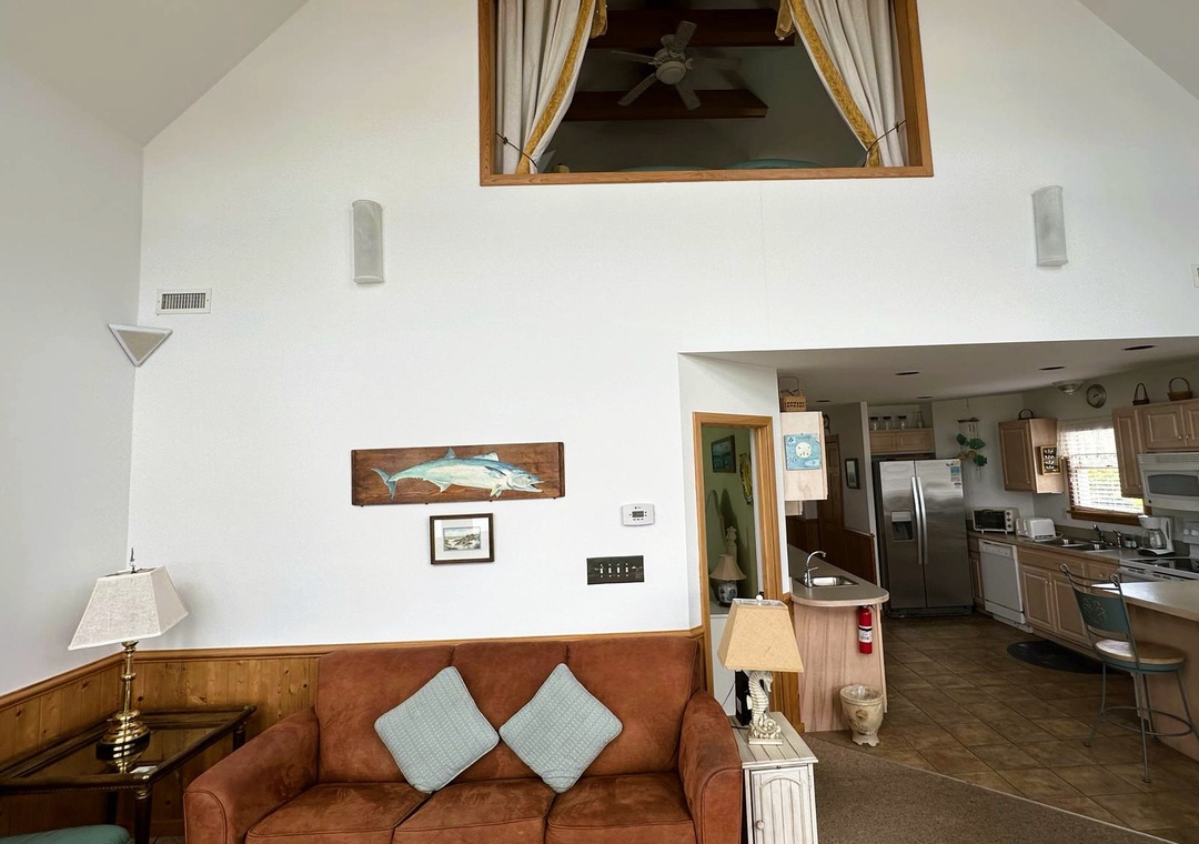 Bedroom A on the upper level has a king bed, TV, and bath. There is also a second story loft open to the first floor, with 2 twin beds, full bath with shower only and a mini-fridge, sink, TV and small sitting area.