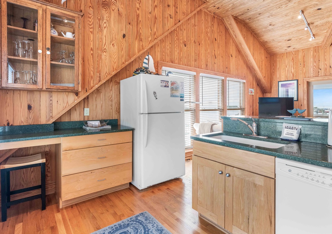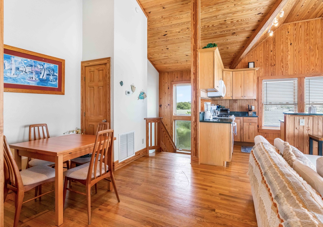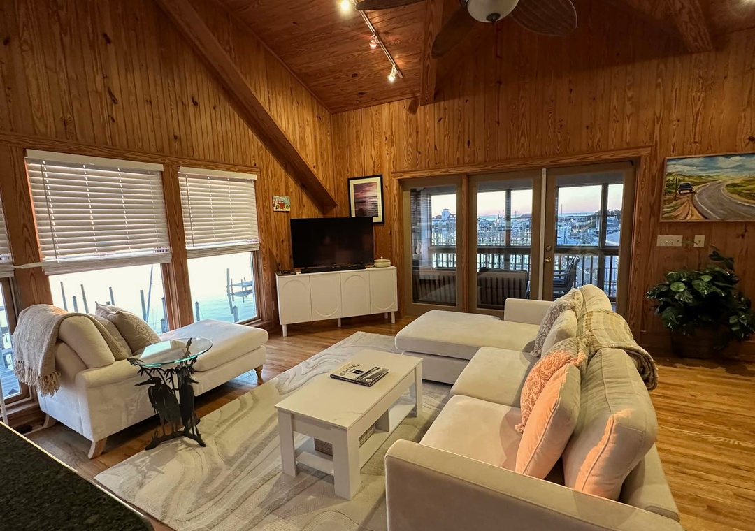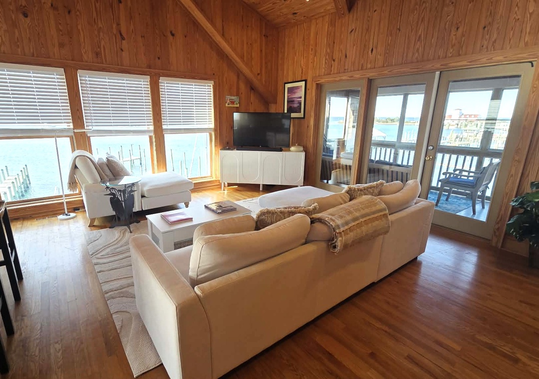 Step inside and unwind in the light-filled top-level living area, where cathedral ceilings and local artwork create an inviting coastal ambiance. The reverse floor plan maximizes your water views, making it easy to soak in the scenery whether you're cooking breakfast, lounging with a book, or watching the sunset paint the harbor.