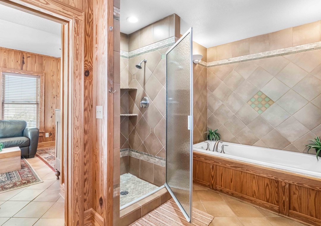 -Shared bathroom with whirlpool tub + shower