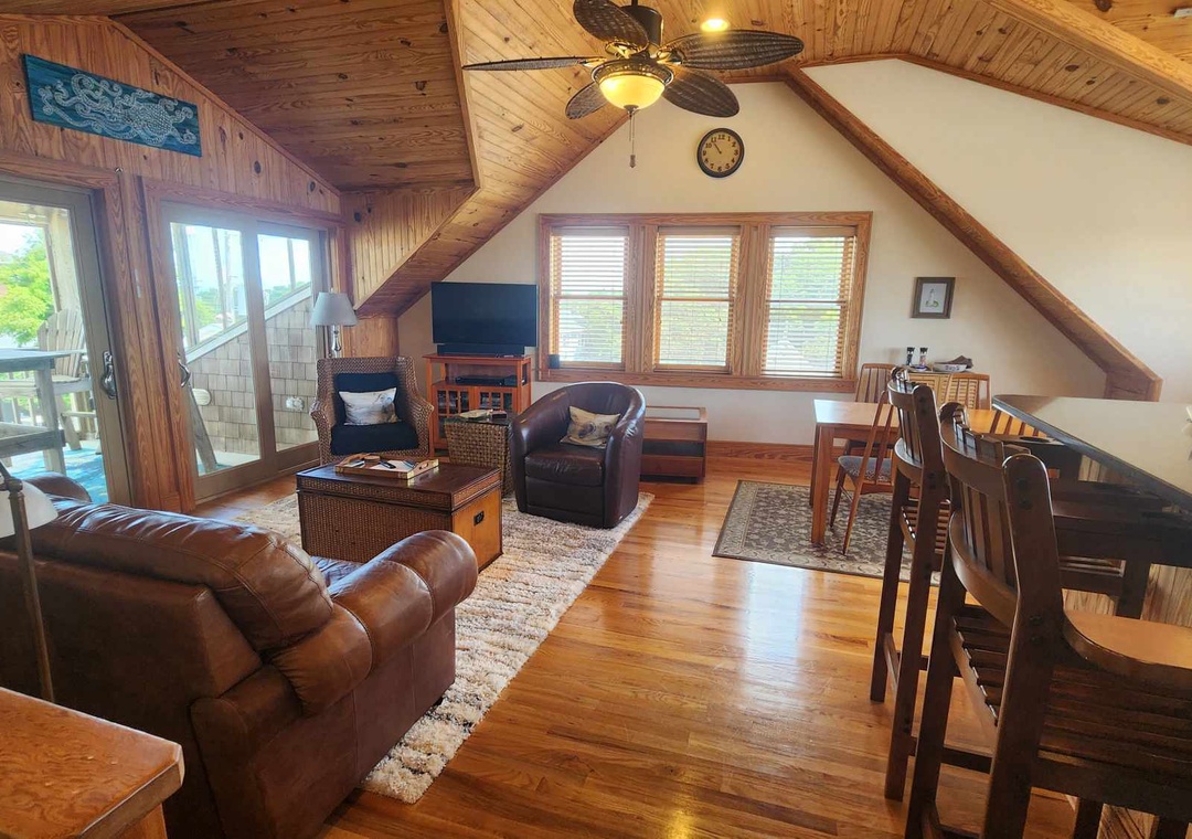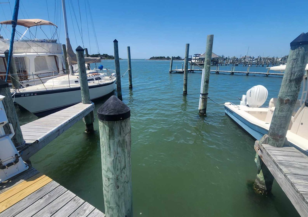 Look forward to the ultimate harborfront vacation experience at Down Creek 104, a meticulously maintained and thoughtfully crafted 2 bedroom condo where you can admire the fabulous sunsets and water views of Silver Lake. This highly desired location puts you right in the heart of Ocracoke Village where you'll be within walking distance to shopping, dining, galleries and activities. This luxurious condo consists of two bedrooms, one with a king and a second with two XL twins. They share a full bath that features a whirlpool tub, separate tiled shower and dual vanities. The reverse floor plan situates the open-concept great room on the top level, which boasts vaulted ceilings and original wood paneling for warmth and character. It leads out to a screened porch where you can relax at the bar table with a cocktail while watching the ferry departures. When you're not trying out one of the nearby restaurants, get dinner started at home in the well-equipped kitchen with gas stove. Guests can bring their boat and use dock slip #6 (42' long x 14' wide). Shared exterior amenities include an enclosed outdoor shower, grilling area and fish cleaning station.