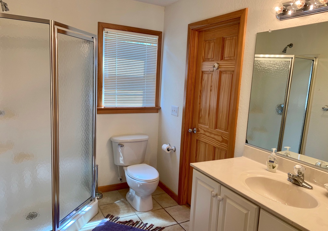 3 Bedrooms, 2 Baths: 1 with King, 2 with Queen. Shower only in first-floor bath.