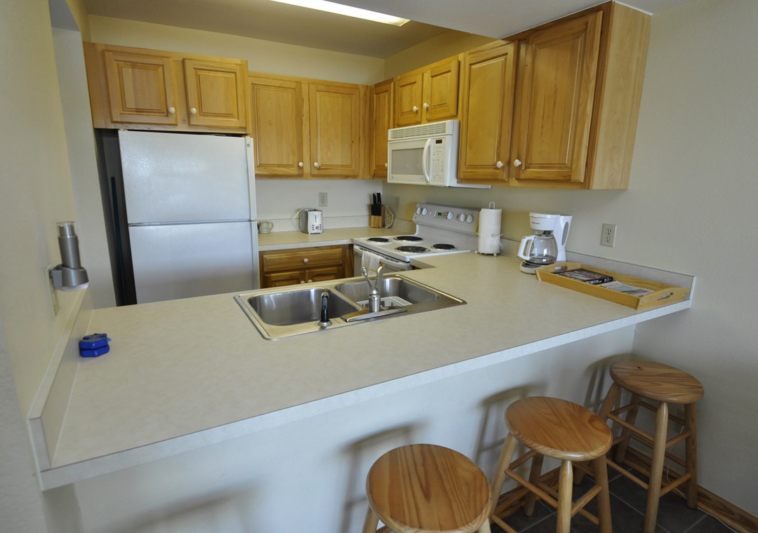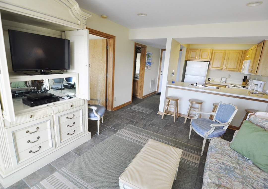 Suite 203 offers second floor accommodations providing the privacy of one bedroom with queen size bed and 1 and ½ baths. For a flexible sleeping arrangement, a sleeper sofa is offered in the living area. The fully equipped kitchen offers a full sized refrigerator with ice maker, stove/oven, microwave, dishwasher, and a basket-style 12 cup coffeemaker. Regular and decaf filter packs provided. Central AC/heat, complimentary wireless internet access, satellite TV with premium channels, VCR/DVD/CD. All linens provided. Housekeeping service available upon request. No washer/dryer.
