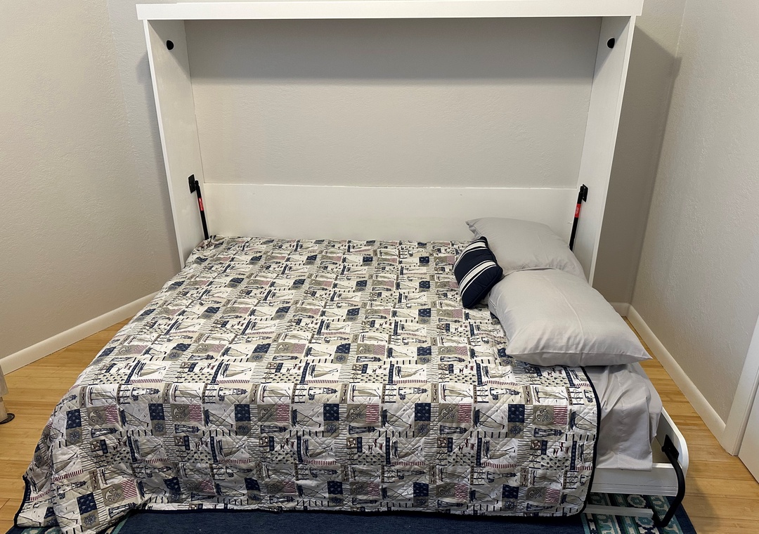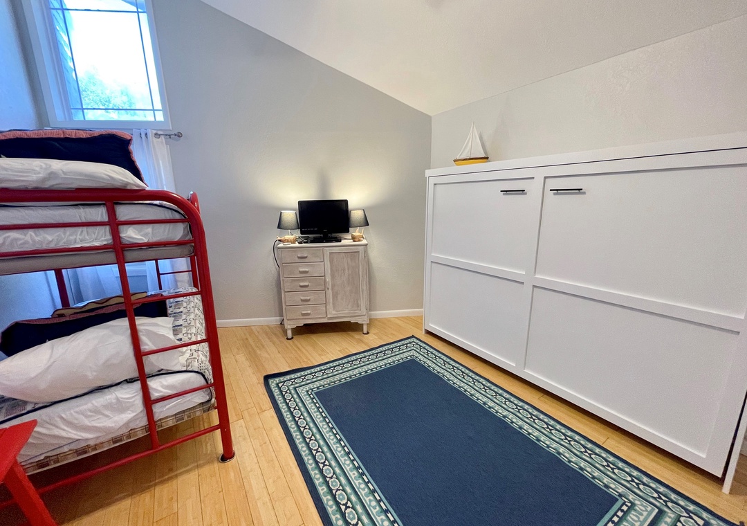 Single story home: Open living area with TV, dining, and kitchen. Bedroom with King bed with TV. Bedroom with a Bunk Bed, Queen Size Murphy Bed, and TV. Hallway bath with tub/shower. Half Bath, Hallway laundry closet with full size stack washer and dryer.