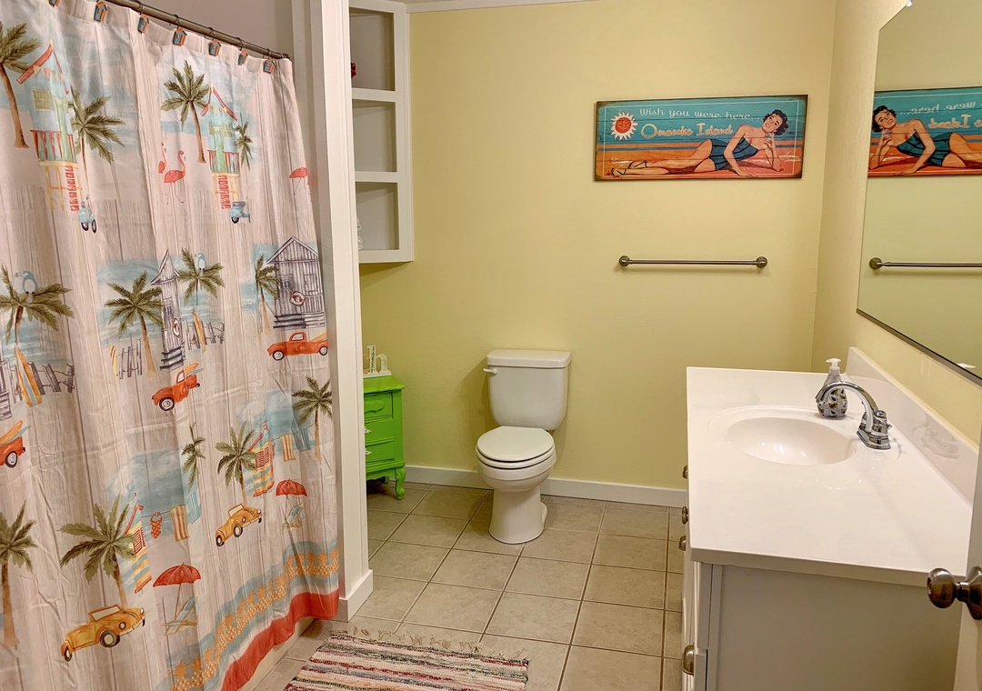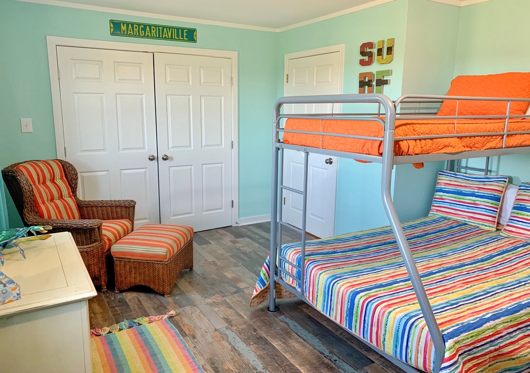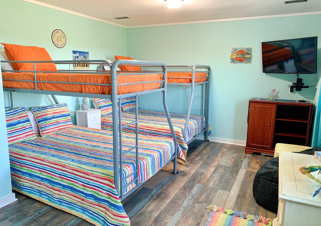 Second Floor: Bedroom with King bed with Roku/Netflix TV and bedroom with two Pyramid Beds (double on bottom and twin on top) with TV for DVD viewing only and Wii. Hallway bath with tub/shower.