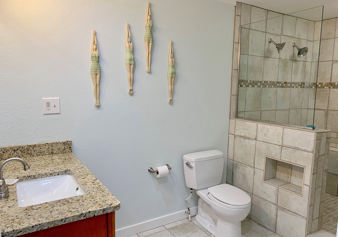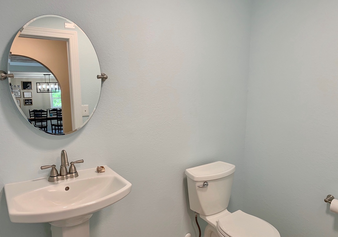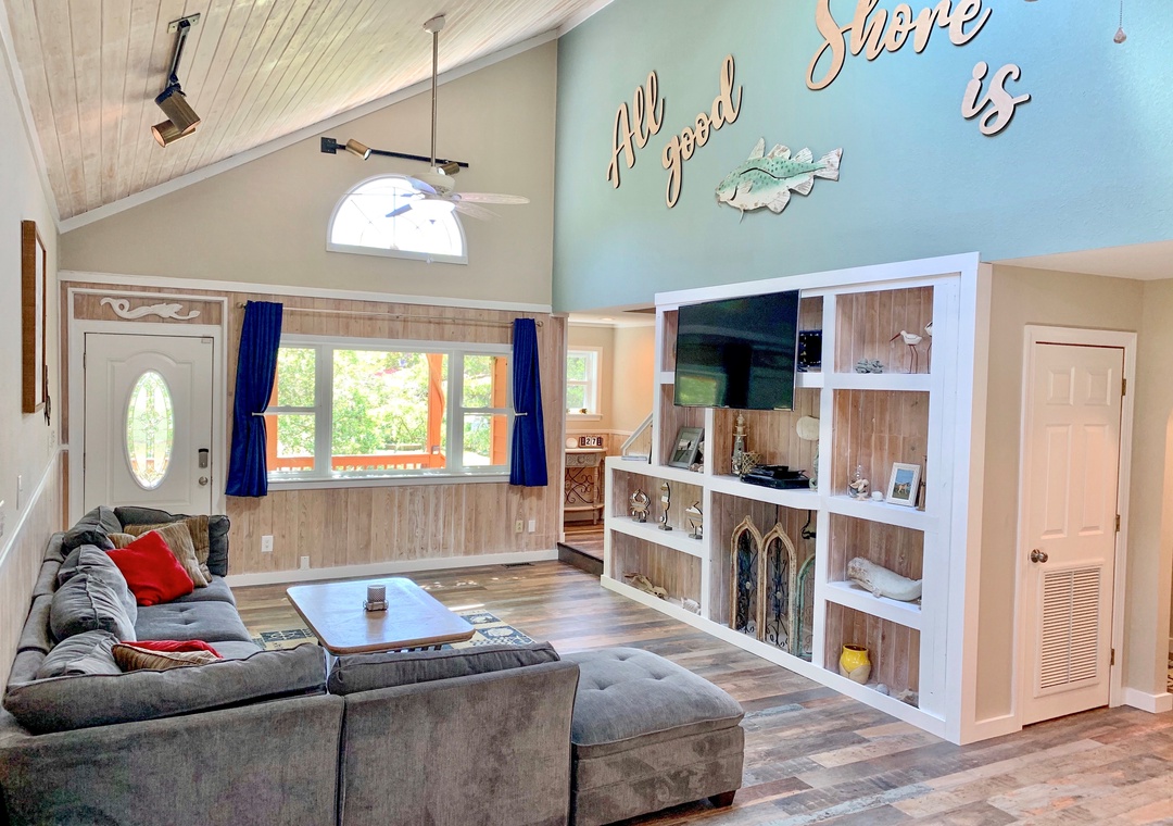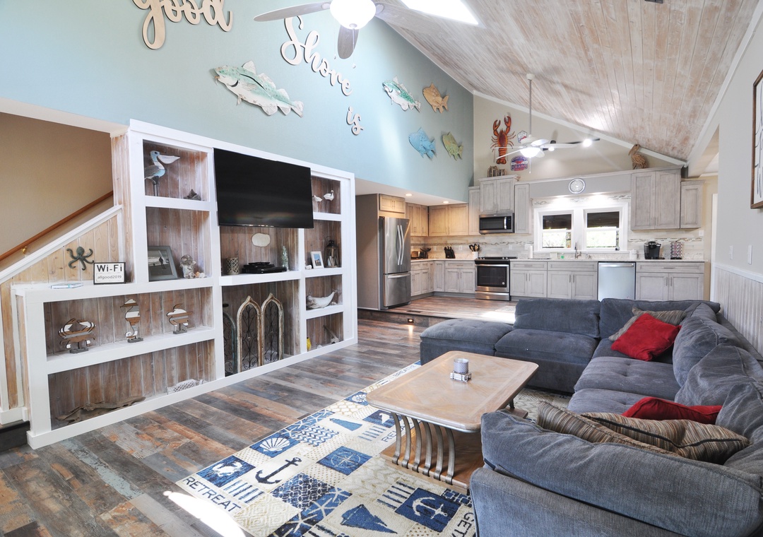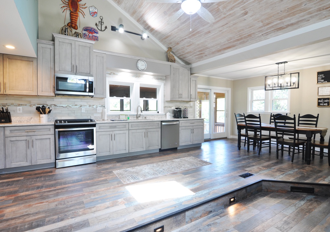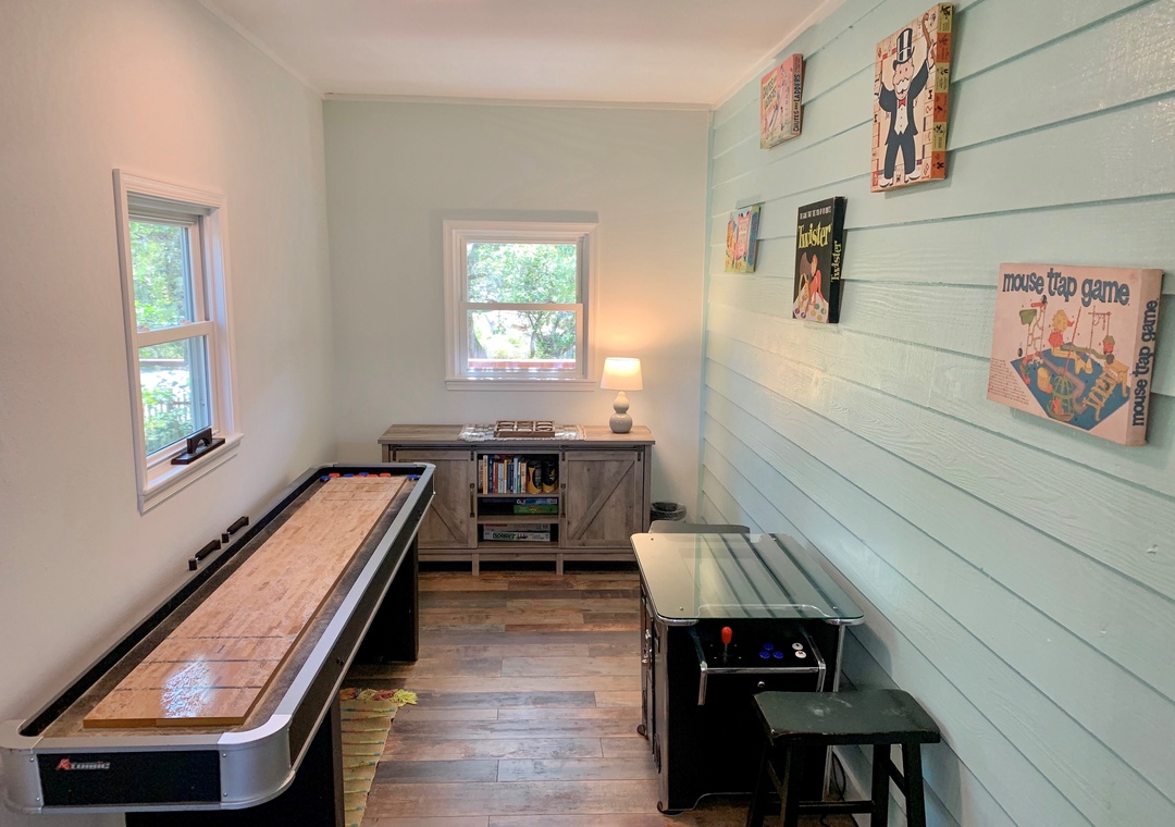 First Floor: Living area with Roku/Netflix TV and open kitchen and dining area. Game room off the dining area. Bedroom with King bed and Roku/Netflix TV. Full bath with walk-in shower. Hallway half bath. Laundry room.