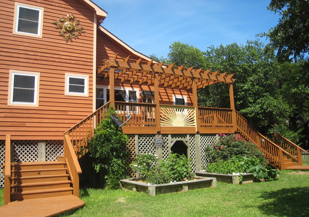 In the morning, enjoy a cup of coffee on the screened porch or relax on the front deck and watch the world go. Sun-Inspired is located on a uniquely spacious island property.