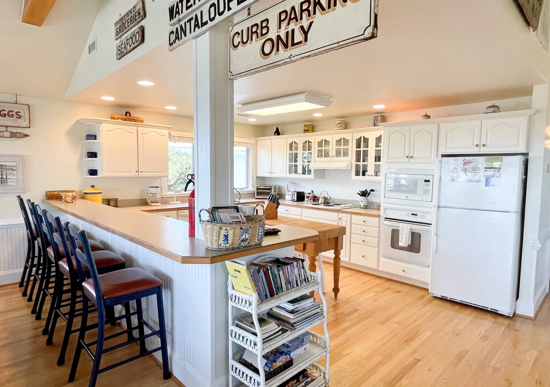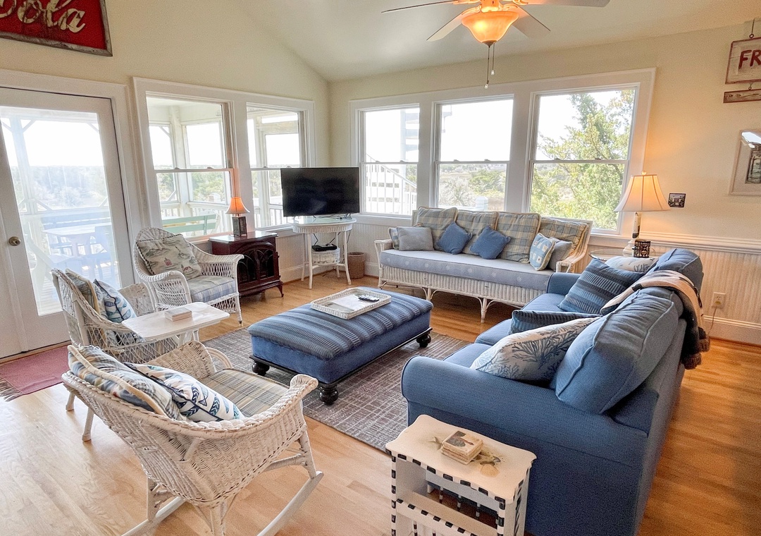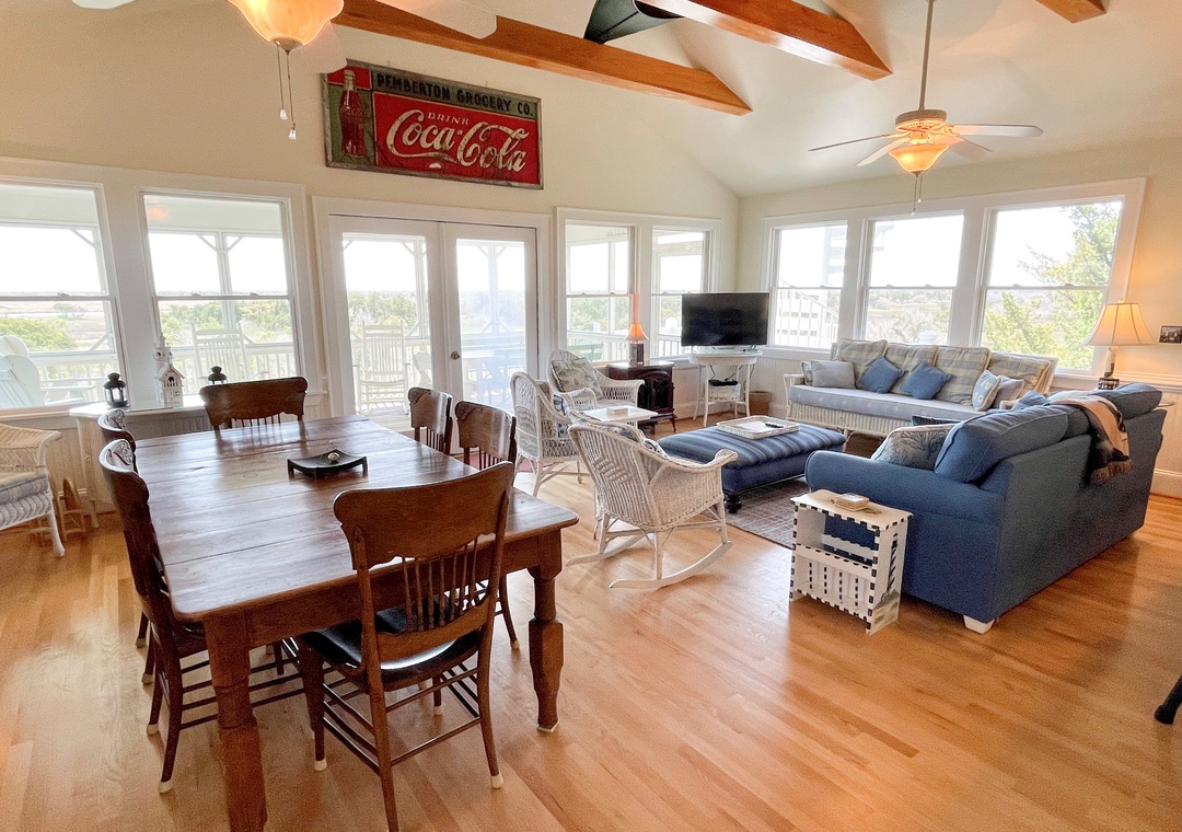 This beautiful reverse living Ocracoke Island vacation home boasts some of the most spectacular unobstructed views of the distant ocean and marsh Ocracoke has to offer. Enjoy the large, comfortable, and airy second-floor living and dining area with an open kitchen, making this home perfect for family get-togethers. The well-stocked and fully-equipped kitchen will delight the vacationing chef. A first-floor den and a unique reading nook provide relaxing getaways. This comfortable and tastefully decorated home is sure to provide wonderful vacation memories.