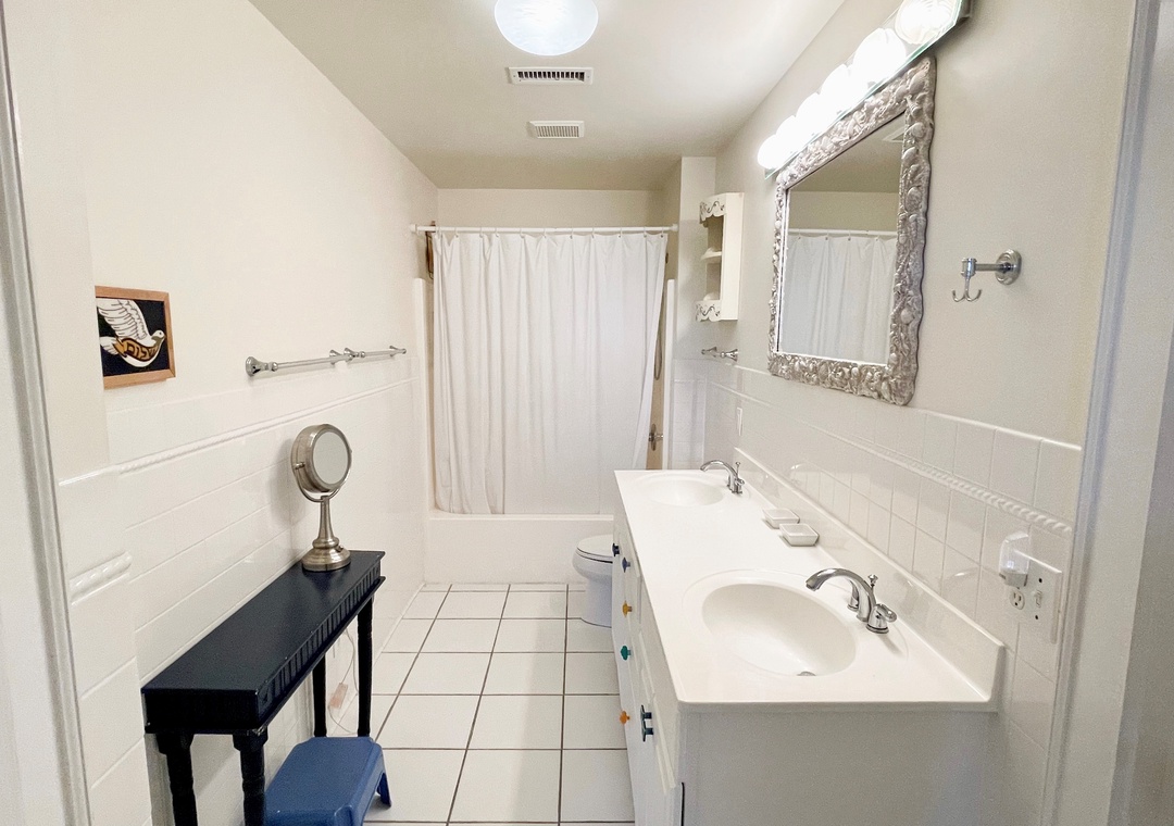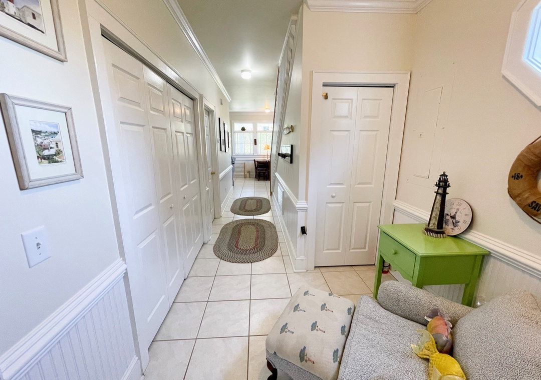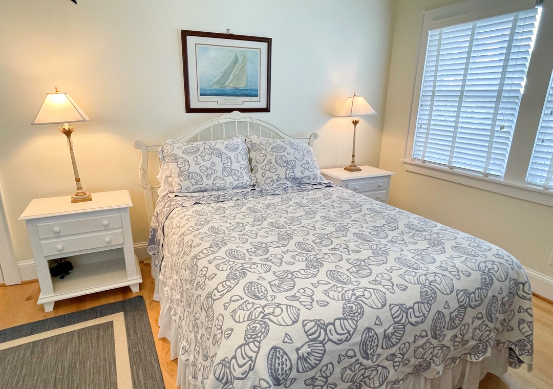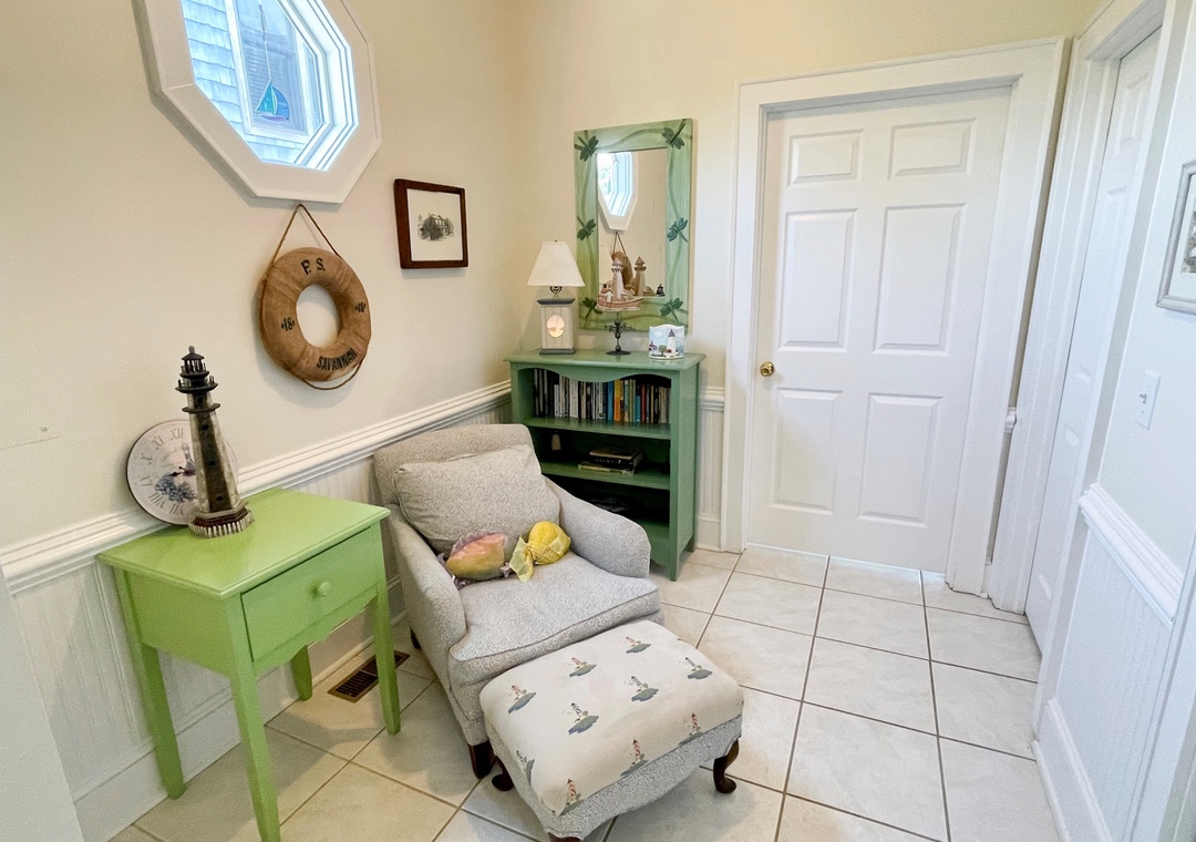 First Floor: Den with Queen Sleeper Sofa and TV. Bedroom with Queen and Double bed. Bath with whirlpool tub and separate shower. Primary Bedroom with Queen bed, TV and Primary Bath with shower stall. A reading nook and hallway laundry closet.