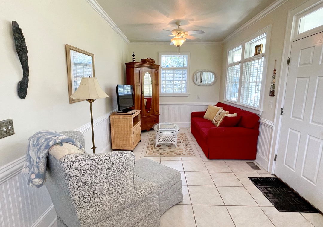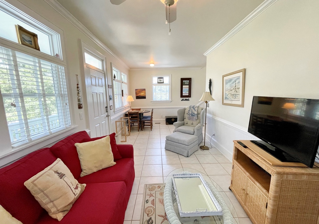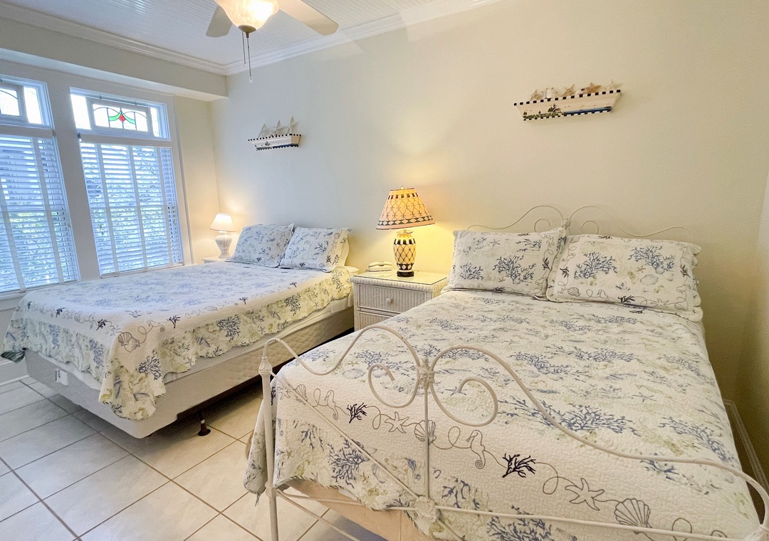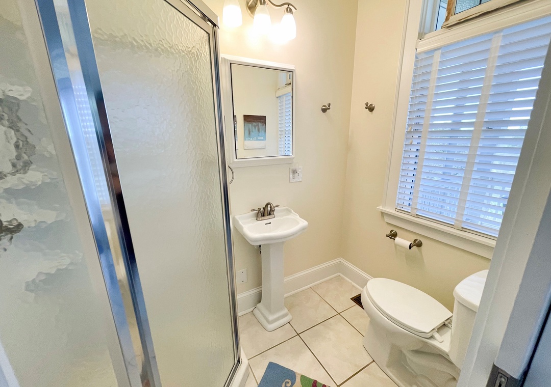 First Floor: Den with Queen Sleeper Sofa and TV. Bedroom with Queen and Double bed. Bath with whirlpool tub and separate shower. Primary Bedroom with Queen bed, TV and Primary Bath with shower stall. A reading nook and hallway laundry closet.