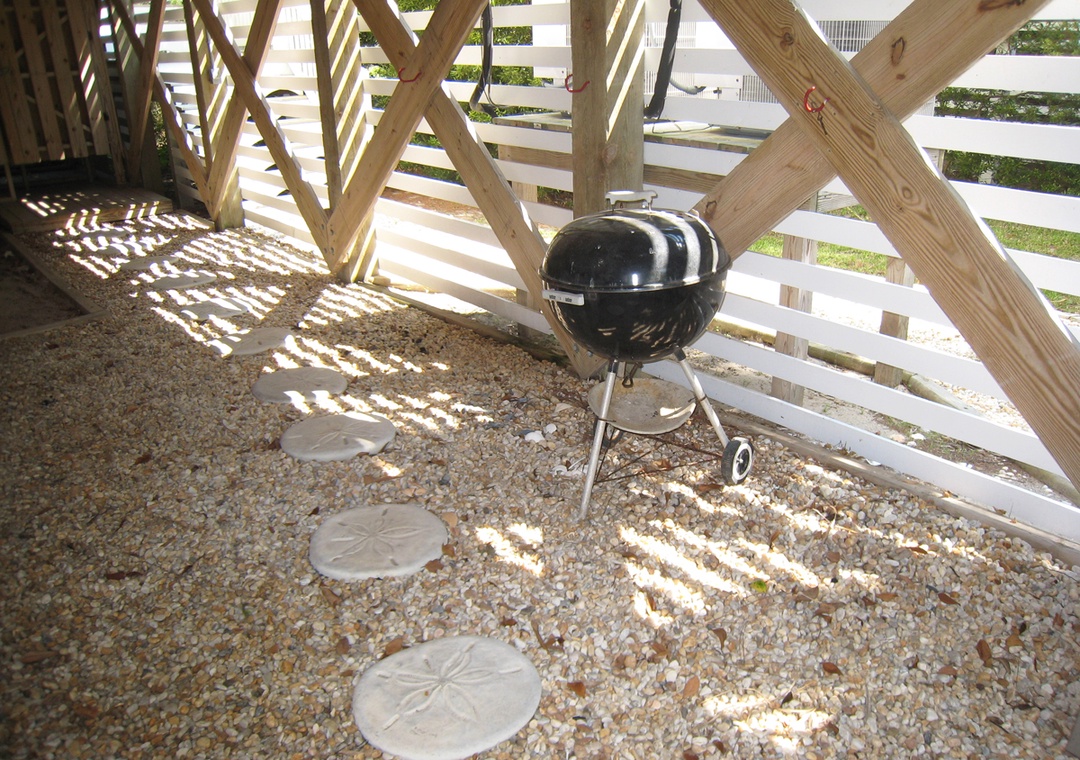 Exterior includes a hot/cold outdoor shower, charcoal grill, and picnic table.