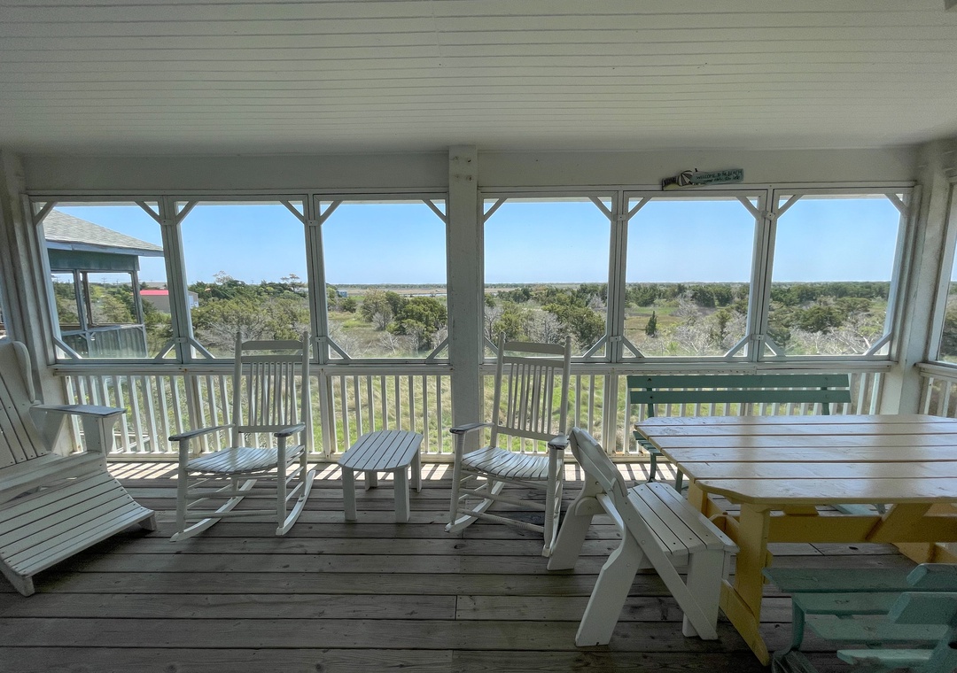 Sea View offers lovely outdoor space, including two spacious and comfortable screened porches, a third-floor lookout deck, and a sun deck, all offering expansive views. Relax on the covered front porch. Start your day with breathtaking sunrises enhanced by the natural surroundings at Sea View cottage.