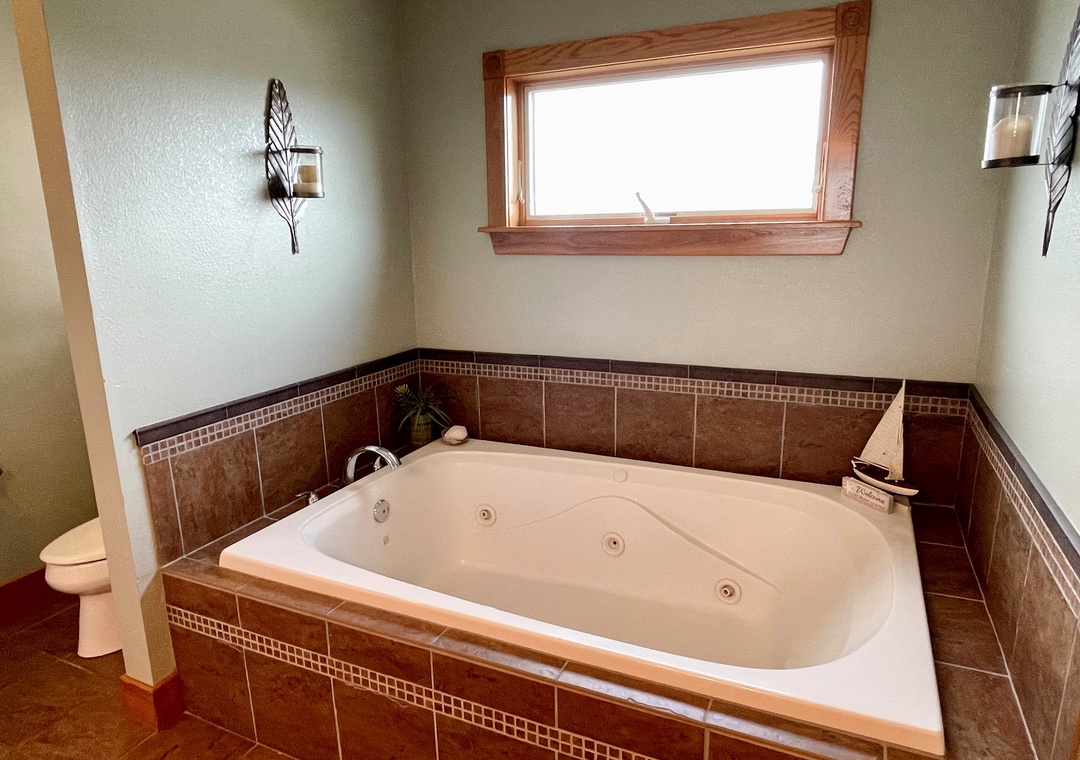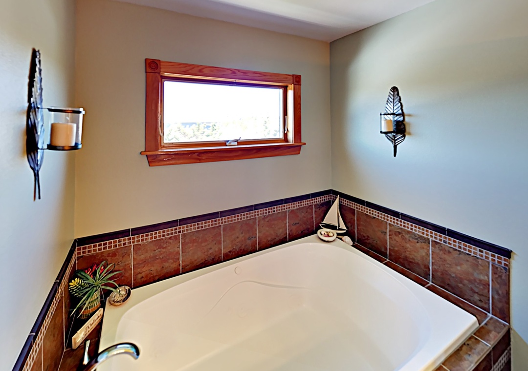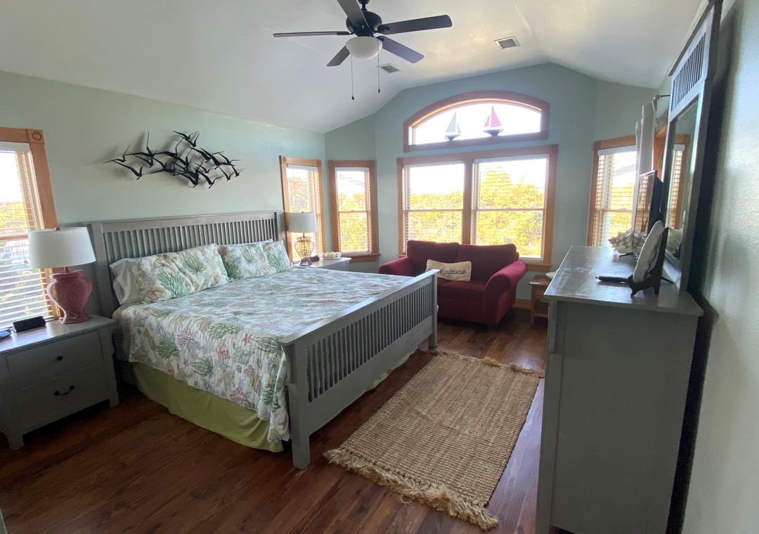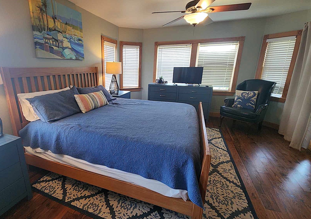 Primary bedroom with king, TV. Primary bath with garden tub (no jets) and separate shower.