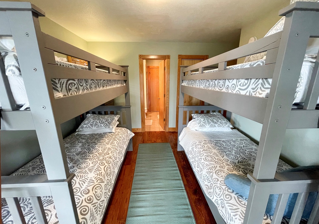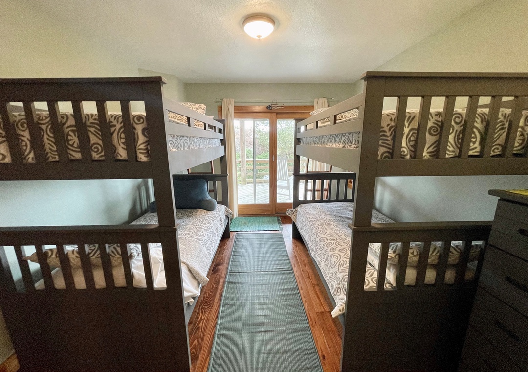 First Floor: Primary bedroom with king, TV, and primary bath with tub/shower. Bedroom with two sets of bunks. Den with TV/DVD, and queen futon which shares a bath with tub/shower. Hallway laundry closet.
