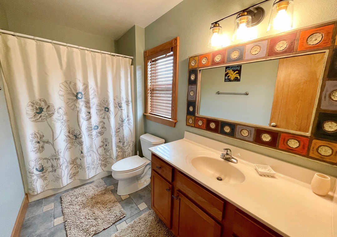Amenities include central air conditioning/heat on each level, and also a gas fireplace for late fall and winter stays only. Enjoy complimentary wireless internet access, and internet/streaming ready TVs. The second floor offers an open layout with cathedral ceilings and ceiling fans, a well-stocked open kitchen with a dishwasher, microwave, and a convenient breakfast bar. The washer and dryer are located on first level.