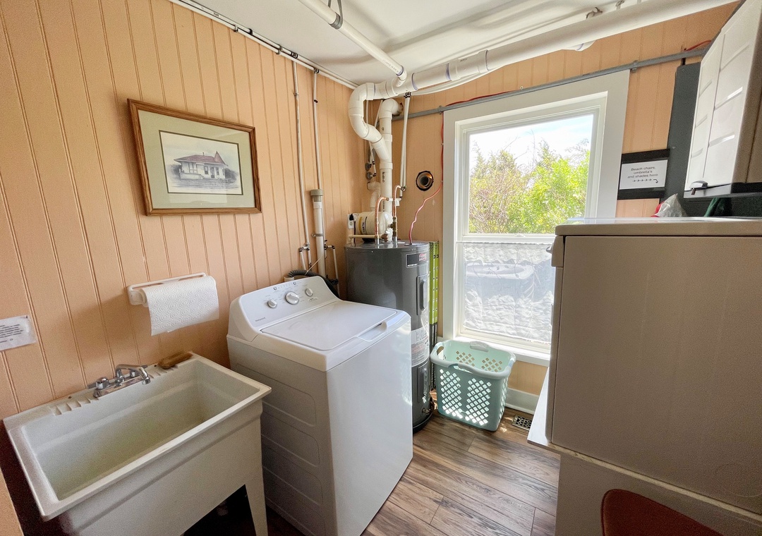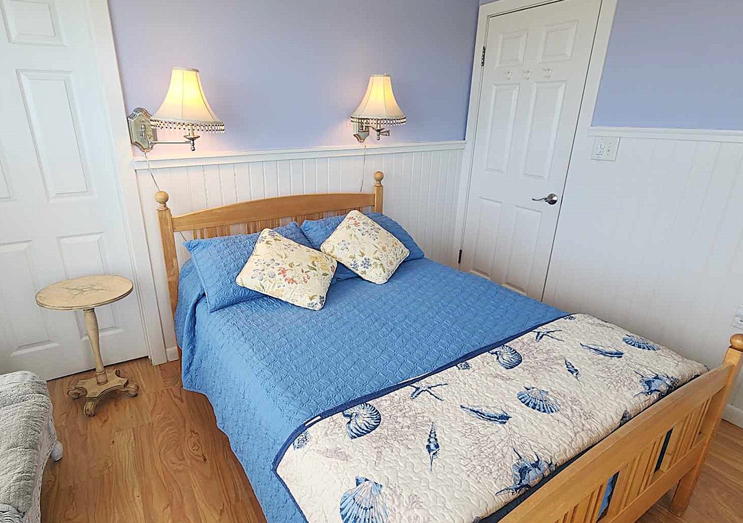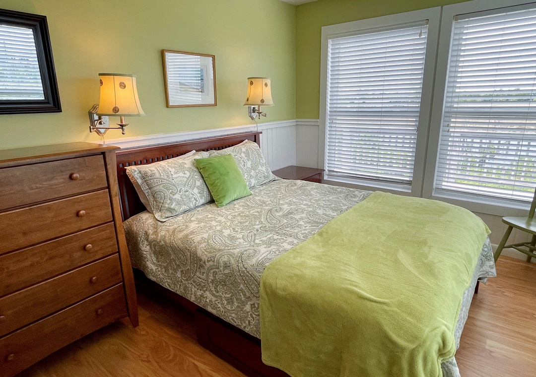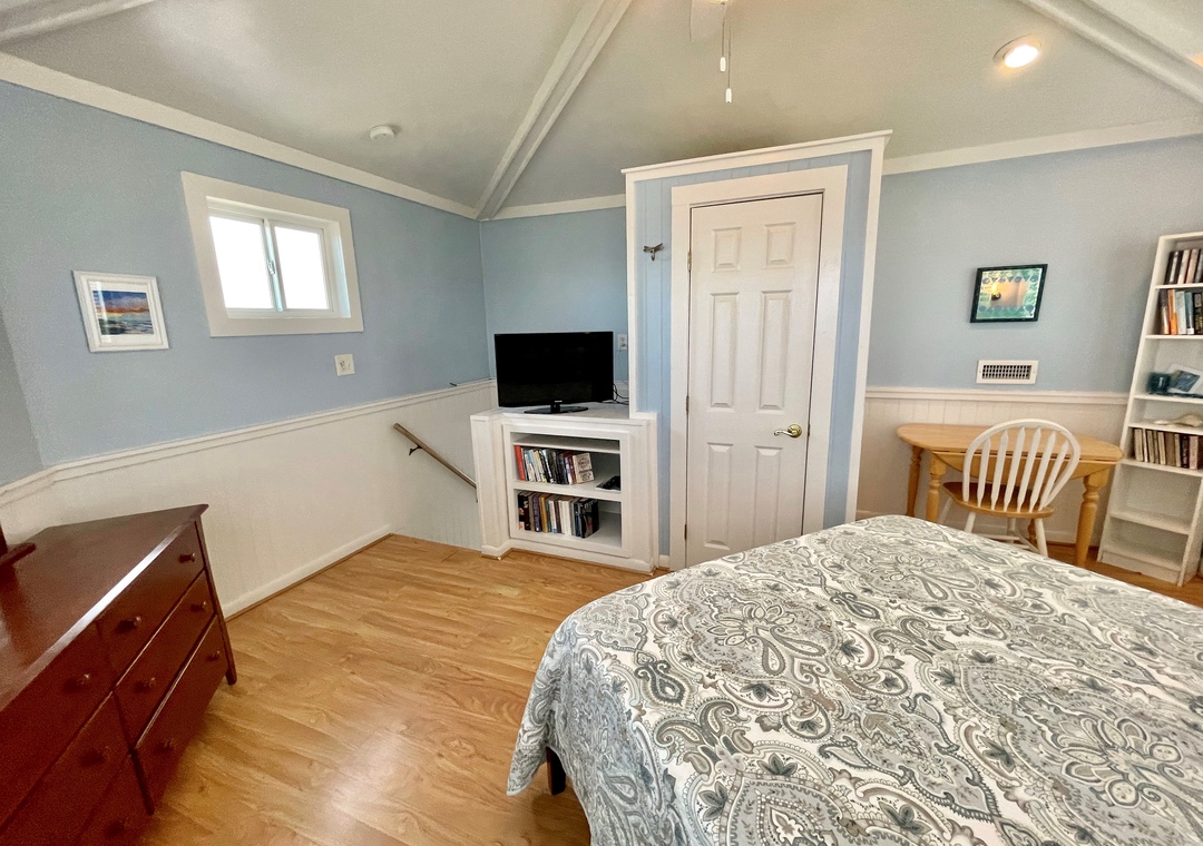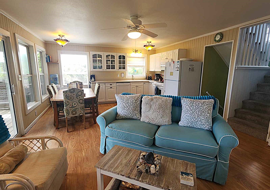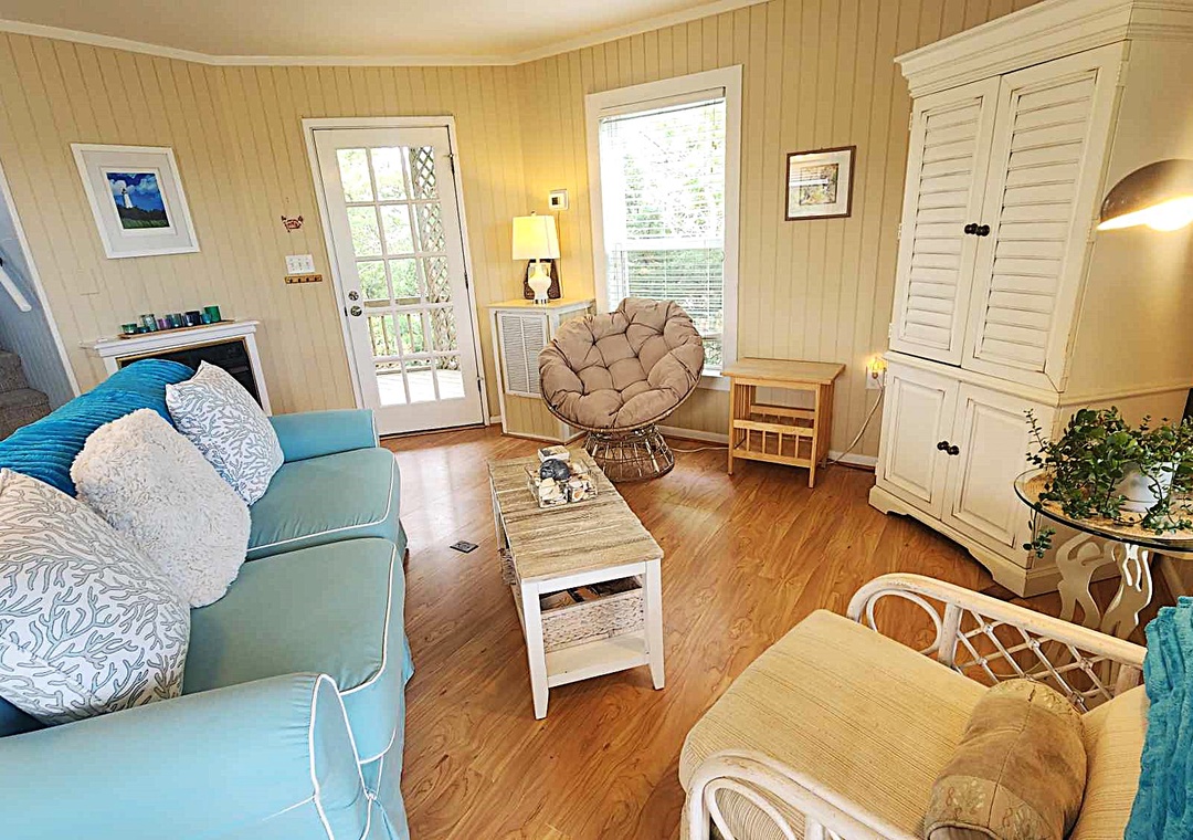 Amenities include central air conditioning/heat, ceiling fans in all rooms, complimentary wireless Internet access, a new Smart TV in the living room, and a flat-screen TV in top floor bedroom with DVD player (no cable). Gas fireplace (Off-Season Only). *Washer and dryer.