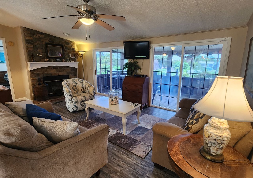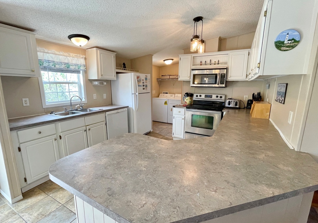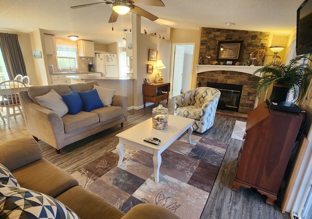 Single story home: Open kitchen, dining, and living area with TV/DVD. Den. Primary Bedroom with King and Primary Bath with walk-in shower. Bedroom with Double and a bedroom with two twin beds. Full bath with tub/shower. Laundry area.