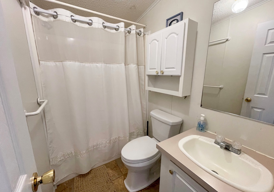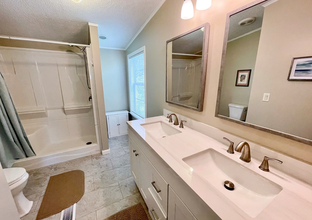 3 Bedrooms, 2 Baths: Primary Bedroom with King, 1 with Double, 1 with 2 Twin Beds. Primary Bath with walk-in shower. The hallway bath has a tub/shower.