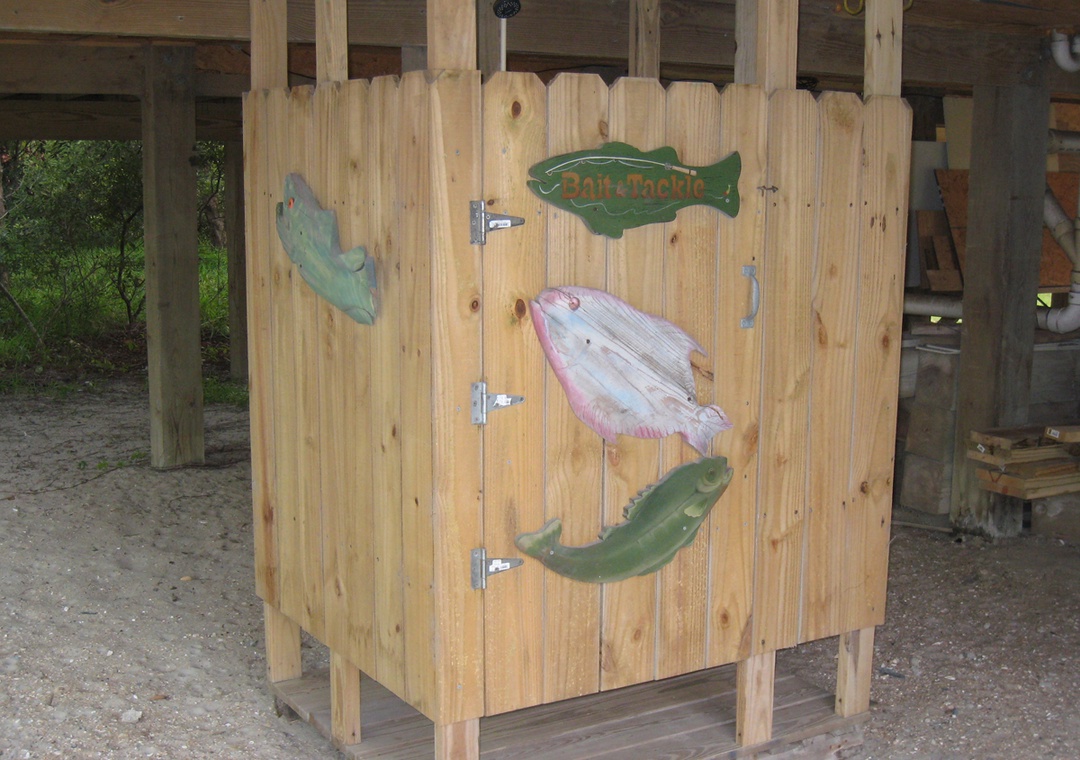 The exterior offers a screened porch, deck, enclosed hot/cold outdoor shower, deck swing, and fish cleaning bench.