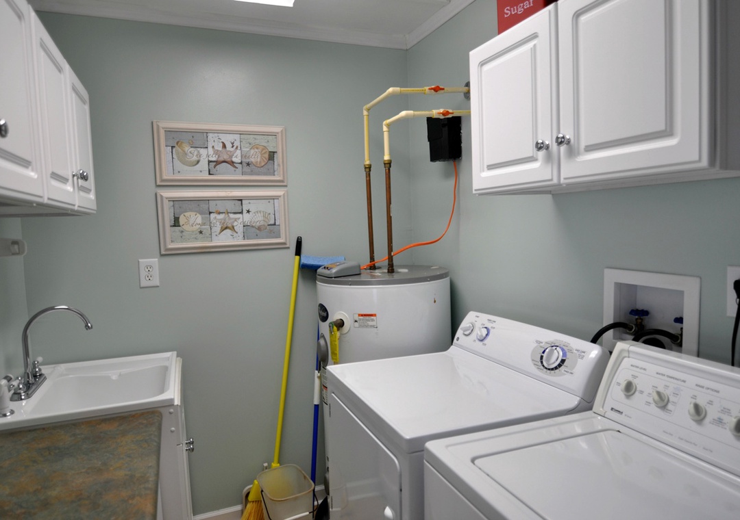 Single story home: Open kitchen, dining, and living area with TV/DVD. Bedroom with two Twins, TV. Bedroom with Bunk, TV. Bedroom with King, TV, and semi-private bath with tub/shower. Hallway bath with shower stall. Laundry room.