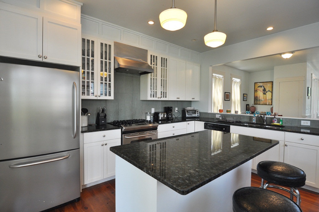 The kitchen offers a dishwasher and microwave, a dining table with seating for six, and a kitchen island with seating for 2.
