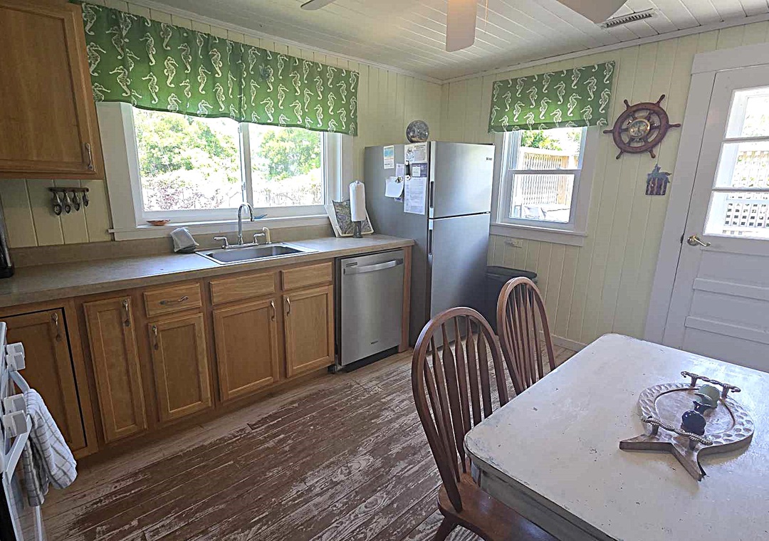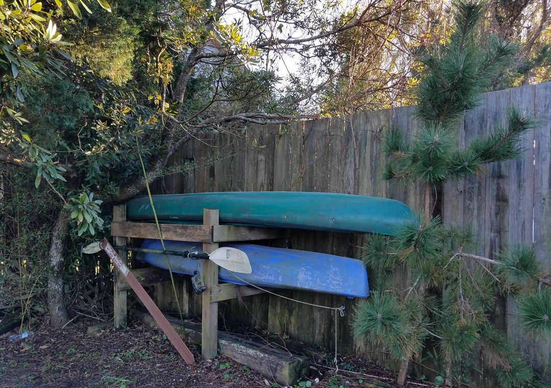 The exterior offers front and rear decks, enclosed yard, hot/cold outdoor shower, gas grill, hammock and a double kayak. Life jackets are not provided, if you wish to rent them, please get in touch with Ride The Wind Surf Shop. They will be happy to assist. The driveway is shared with Sorella's Pizza.