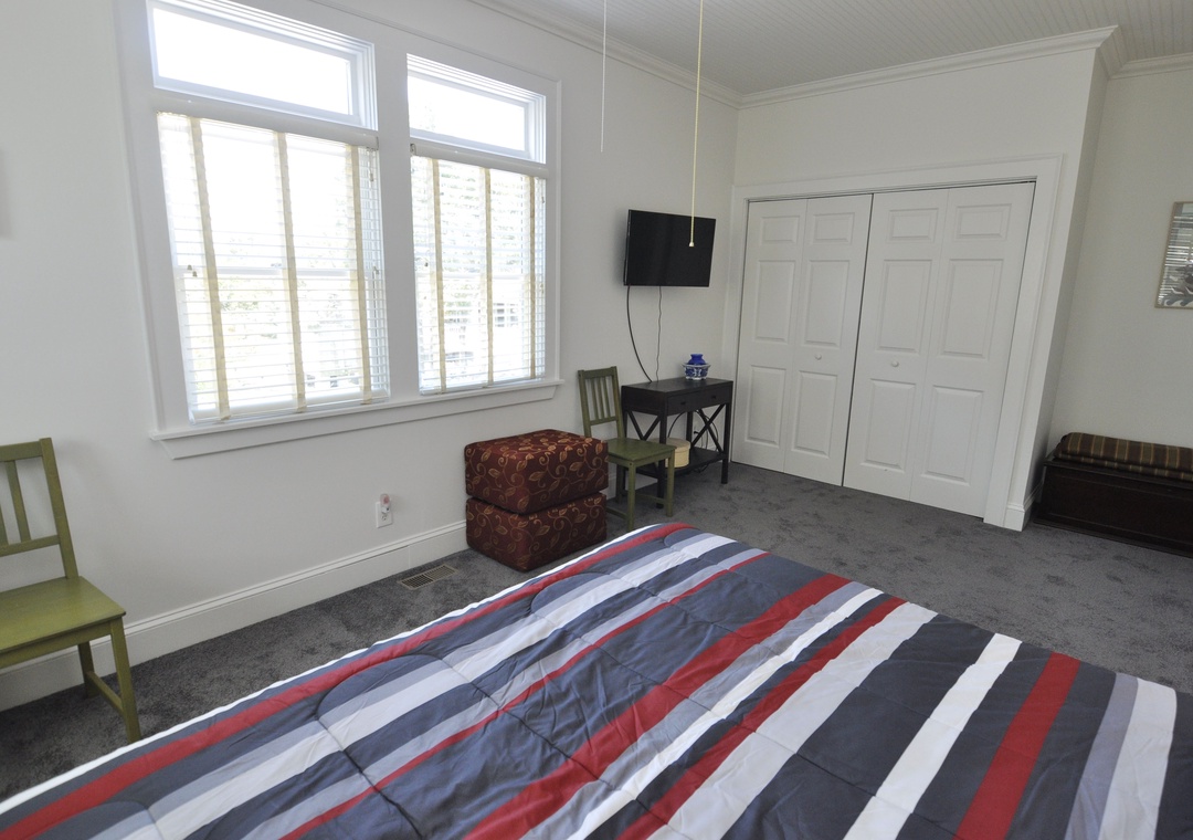 First Floor: Bedroom with King Bed with TV, shared bath with whirlpool tub and separate shower (access via bedroom and hallway). Bedroom with King Bed with TV. Den with futon and TV. Laundry closet.