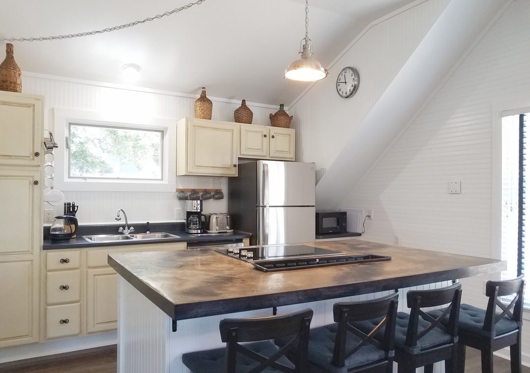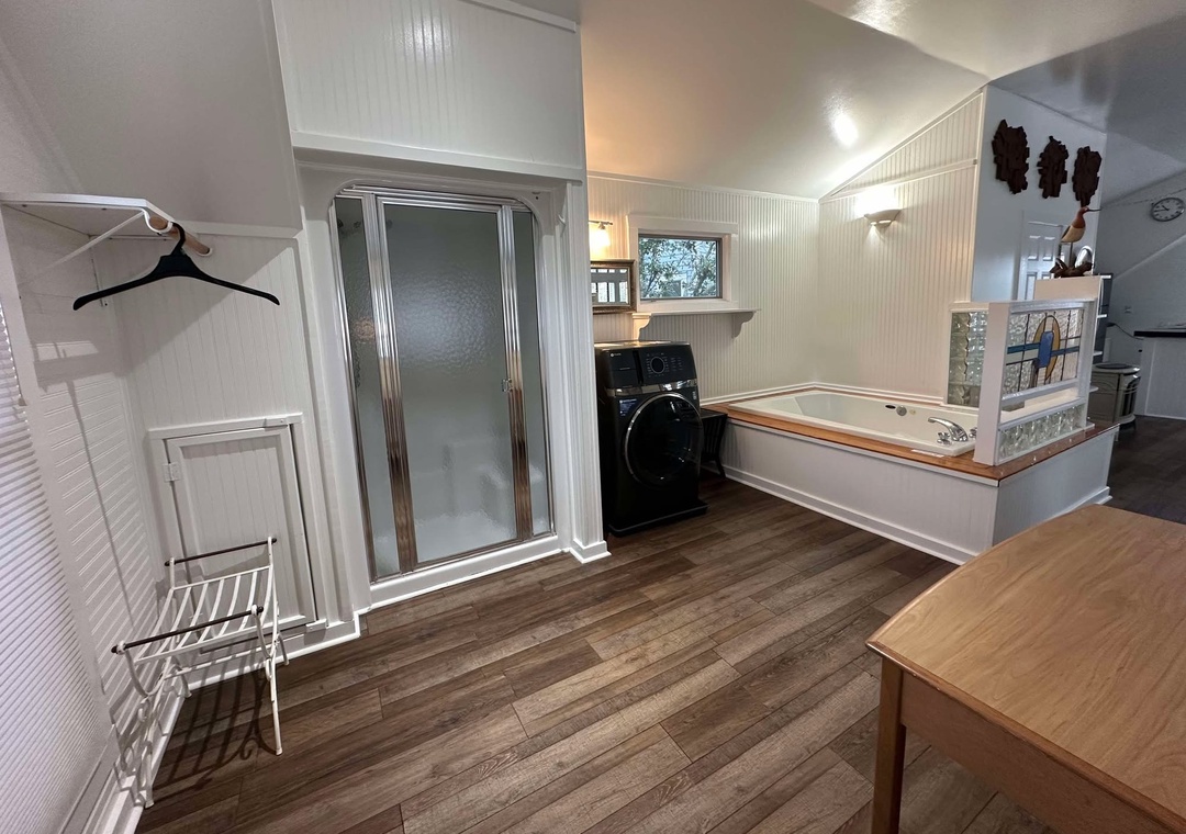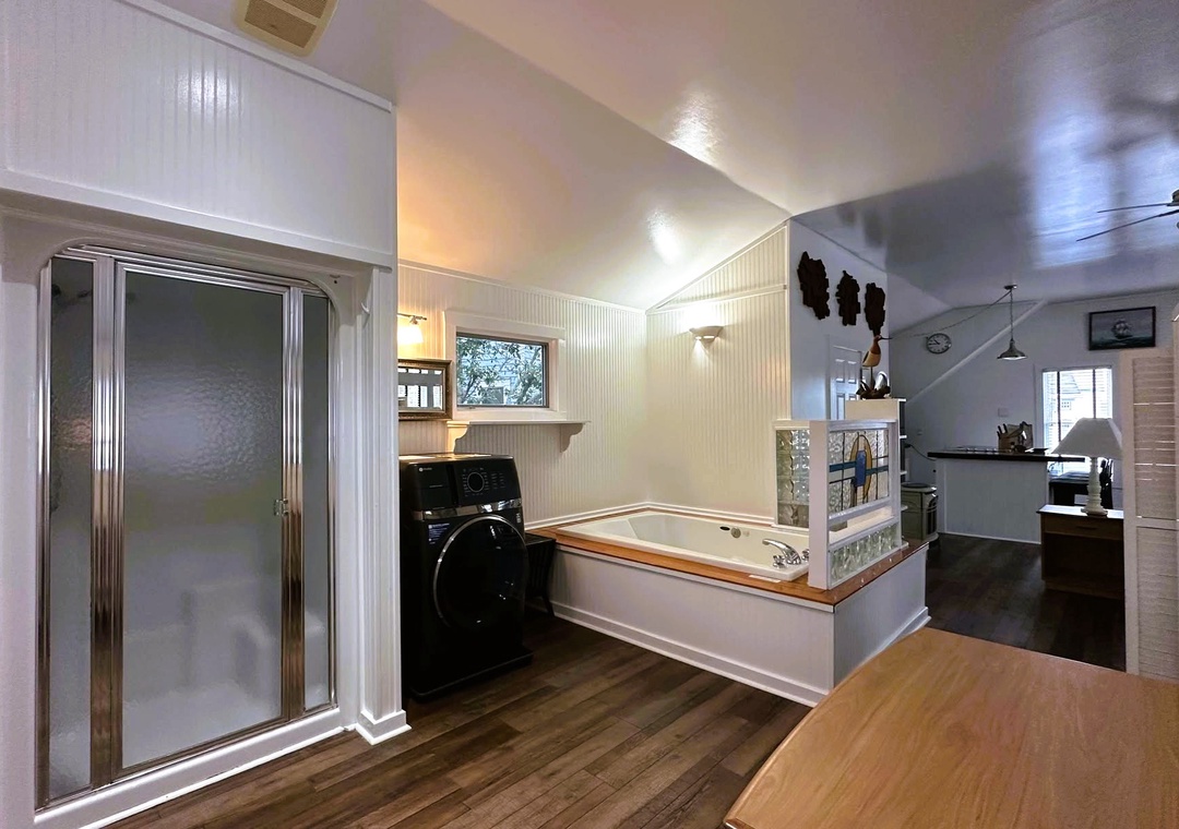 Second-floor single story Studio: Open floorplan, kitchen, dining, and living area with TV/DVD and Queen Sleeper Sofa. Queen Bed in the sleeping area. Open concept bath with soaking tub and steam shower. Stack washer/dryer, bathroom sink, and toilet in the enclosed bathroom.